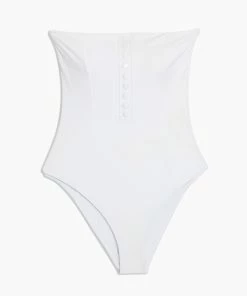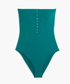 The Adrienne One Piece is a fresh take on a classic strapless swimsuit punctuated by a center placket with decorative snaps. It’s made from a smoothing solid tricot fabric and contoured with slimming princess side seams. The high-cut leg gives it an elongating finish, while inner gripper tape keeps the top securely in place.