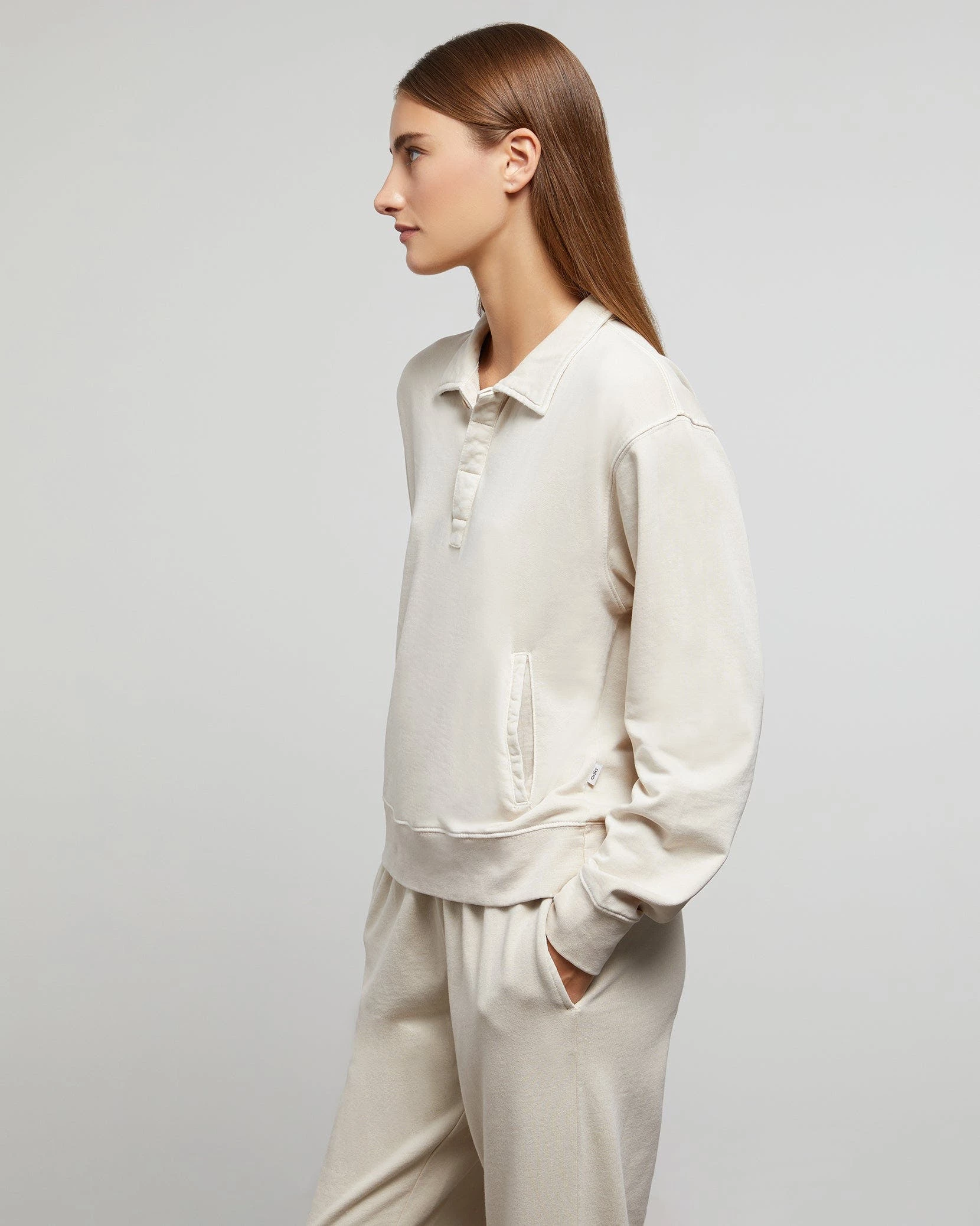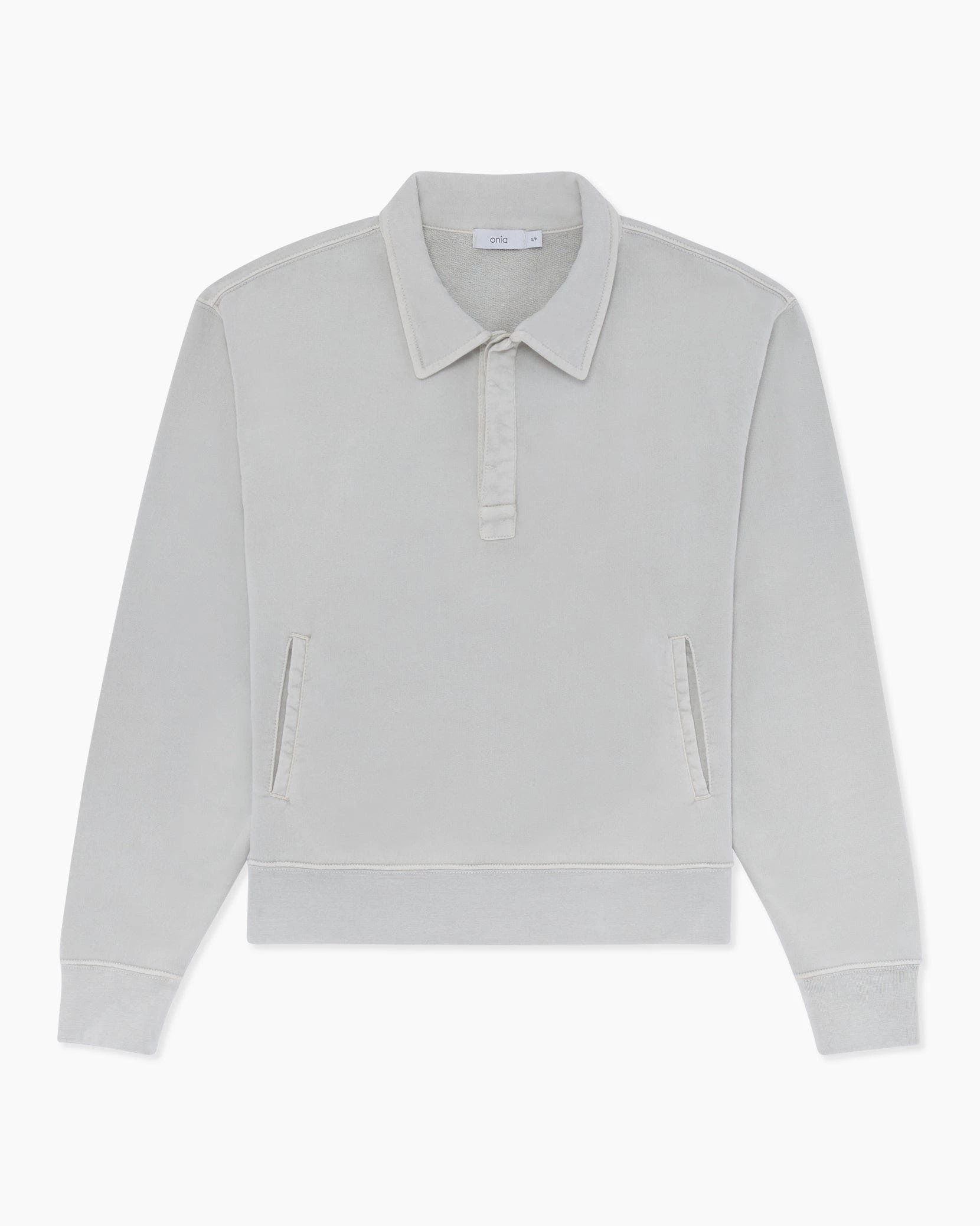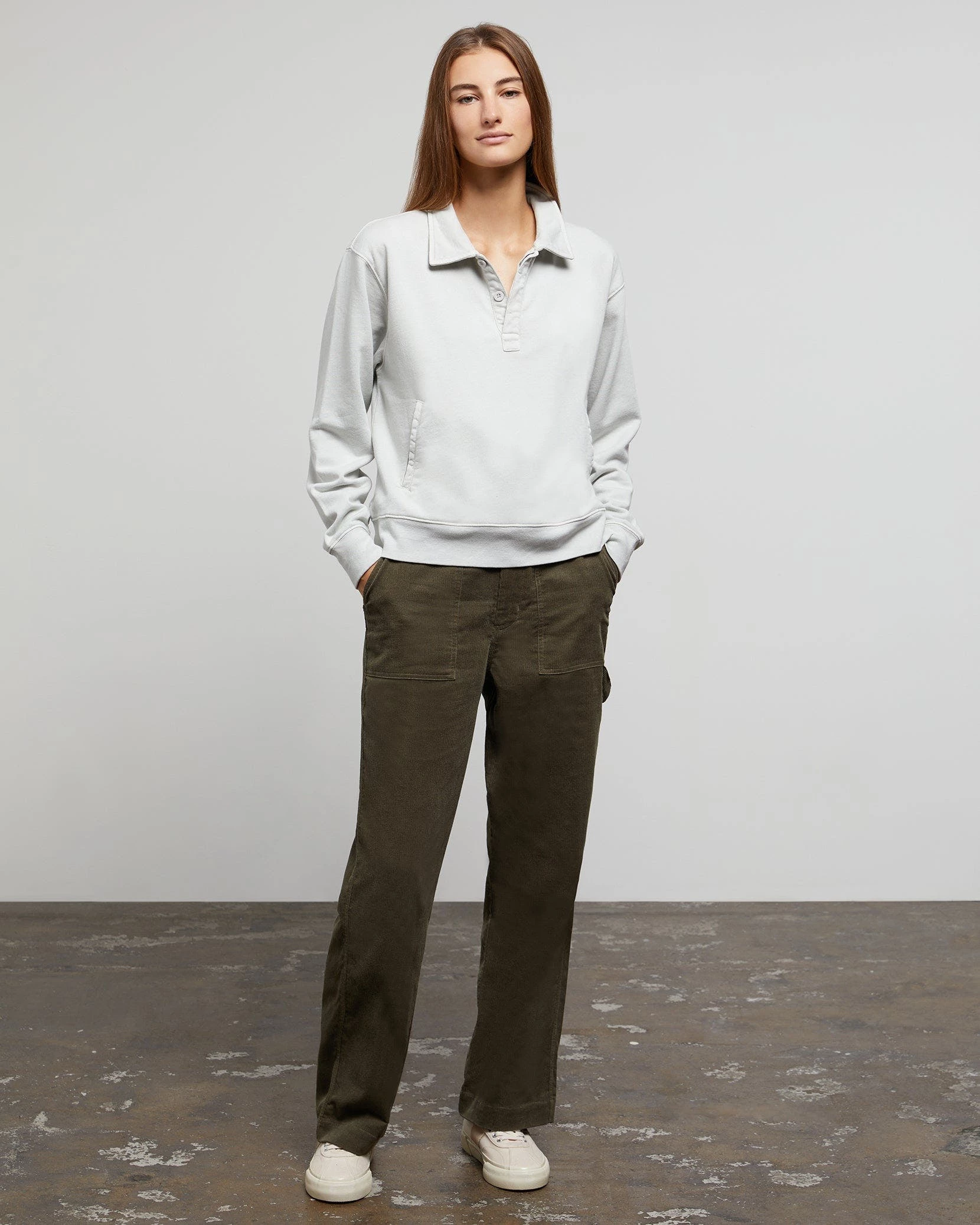 These garment dye terry polo is made from soft cotton that’s been cut for a relaxed fit and detailed with welt pockets, a covered placket and finely ribbed trims. The style is pre-washed to soften its handle.The garment dye terry polo pairs well with the wide leg corduroy carpenter pant.