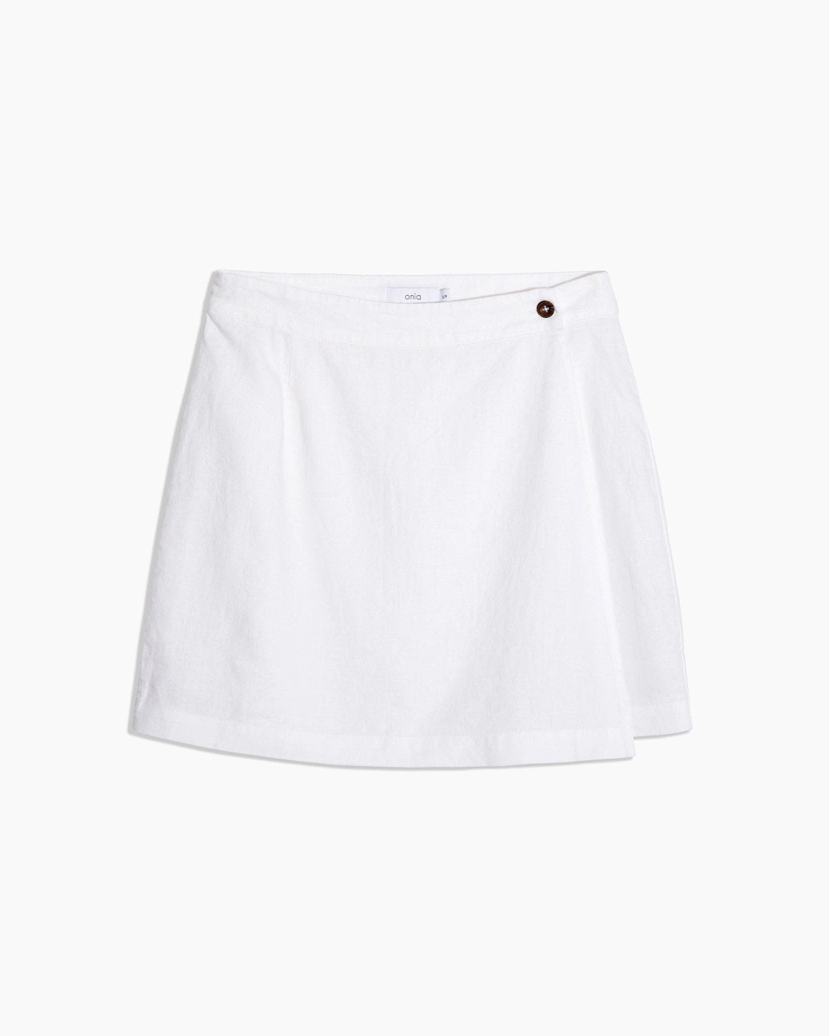 This mini linen wrap skirt is truly versatile, easily segueing from beach coverup to casual daywear. It has a pencil silhouette, cut in a classic crossover style that’s fully lined and a single-button closure at the waistband.