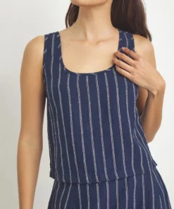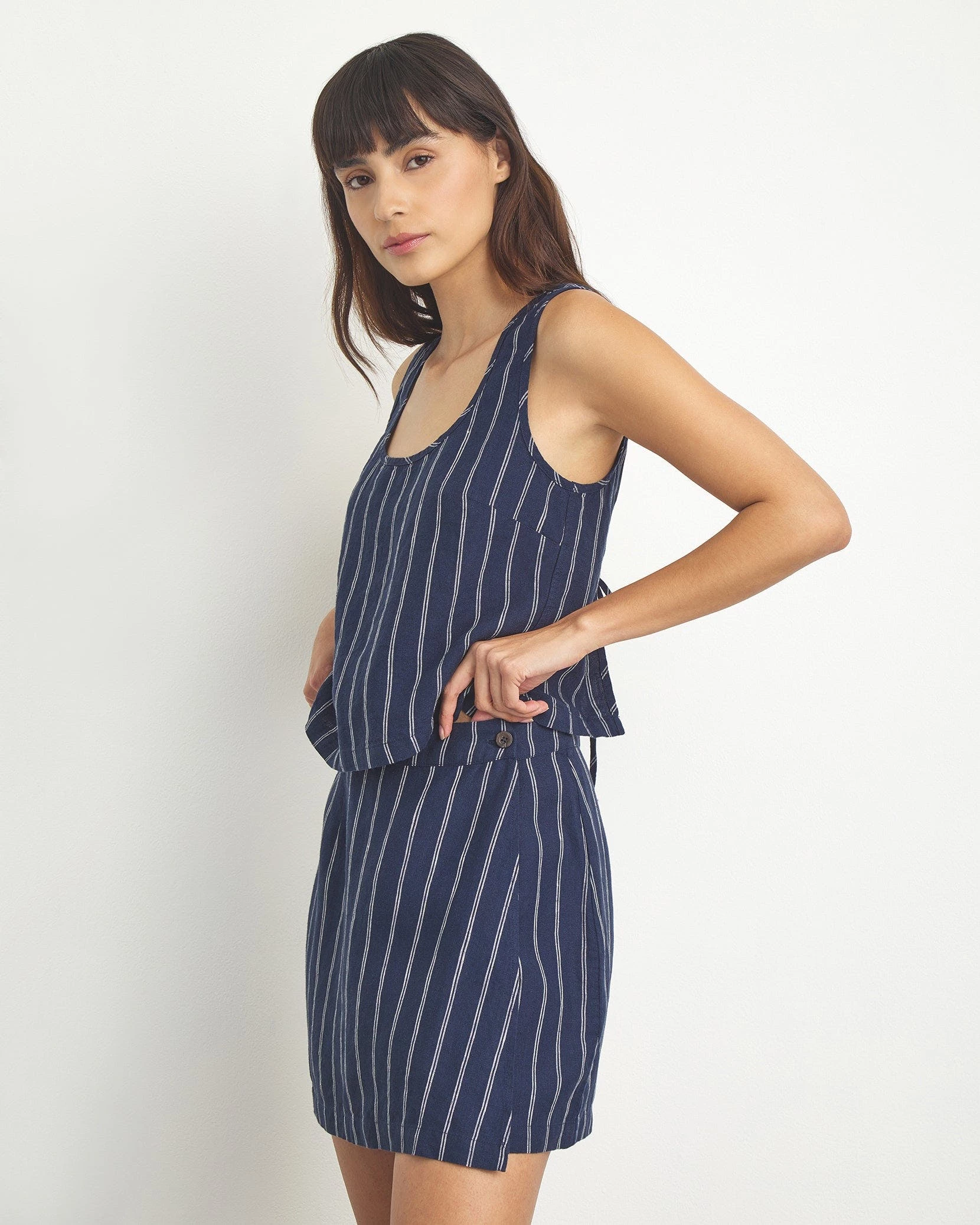 The open back tank has a loose, easy-wearing shape and turns to reveal a skin-baring opening in the back held together with two pairs of slim ties. It’s cut from breathable, lightweight linen to drape effortlessly over your frame.