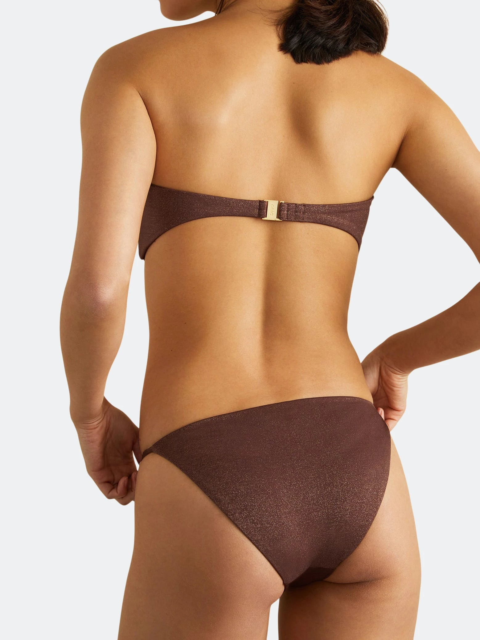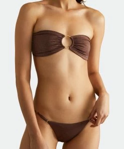 Defined by a brushed gold O-ring at its center, the Luna bandeau has a supportive and flattering shape. Removable padding and light boning add structure while an adjustable three-hook closure in the back allows you to customize the fit.The Luna Bikini Top pairs well with the Hannah Bikini Bottom.