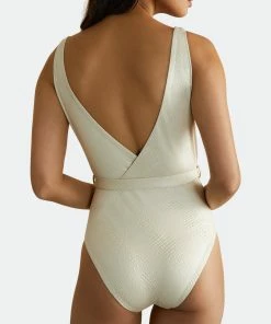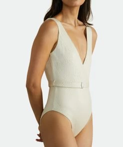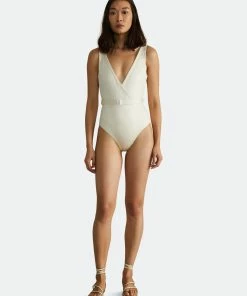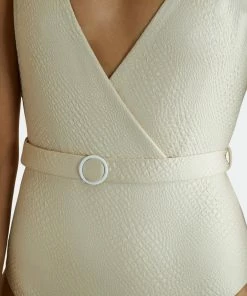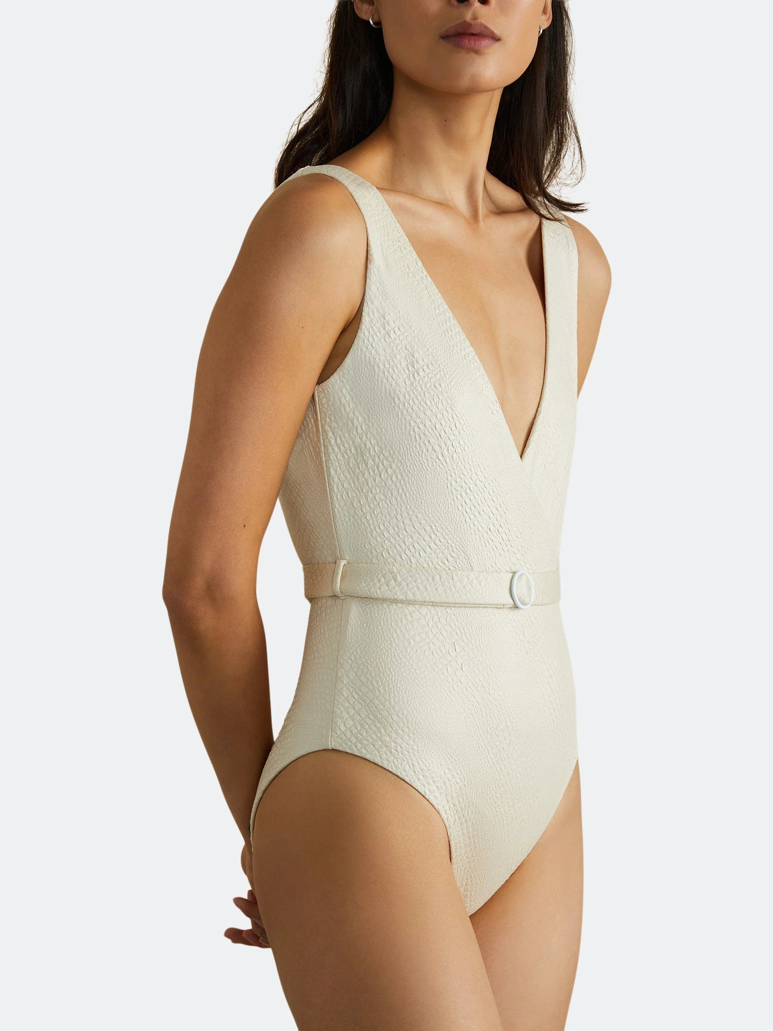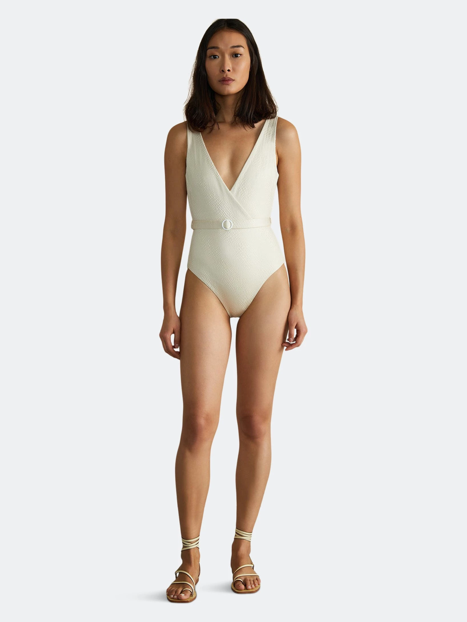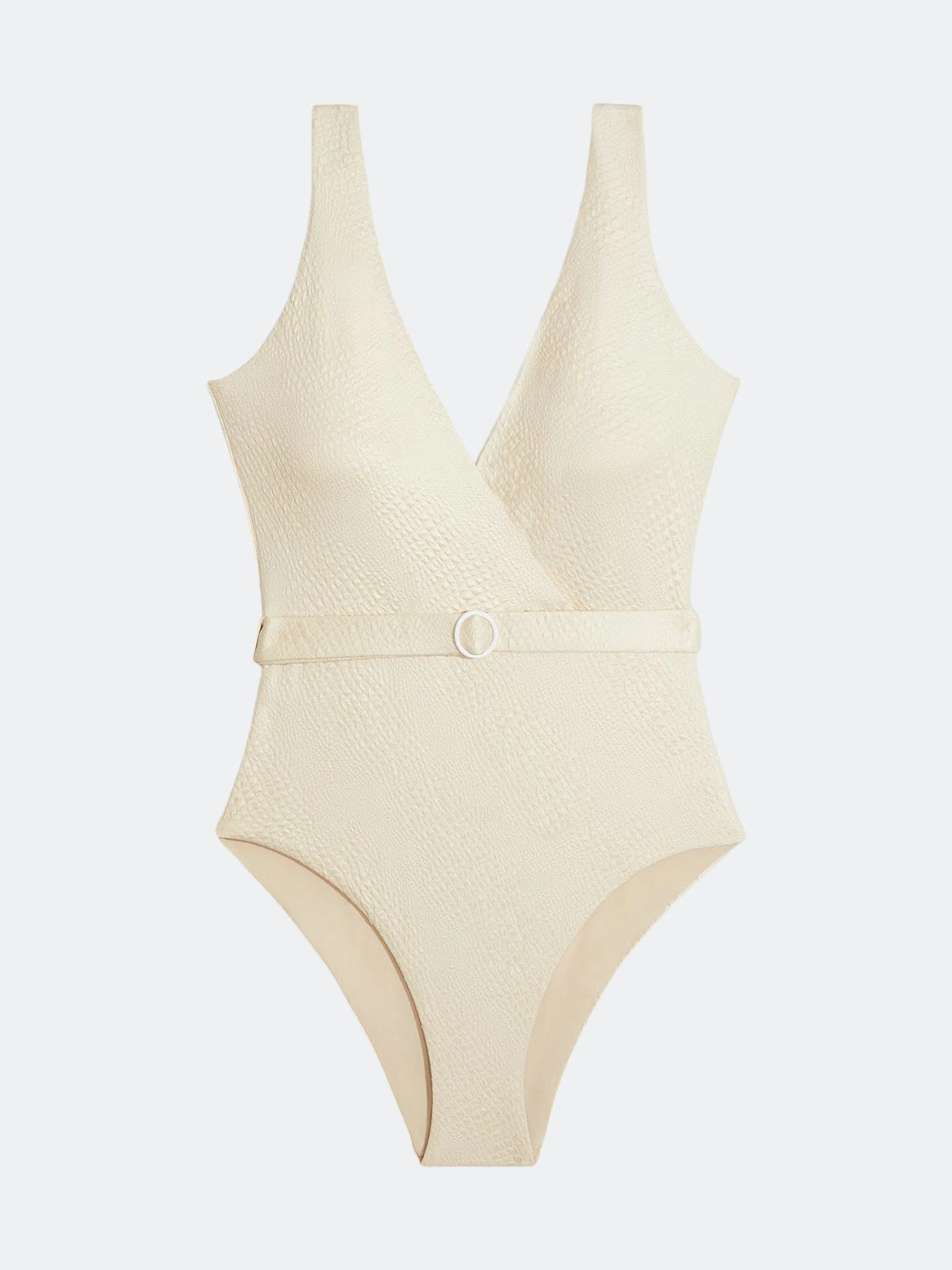 Our michelle one piece is a sculpting maillot suit featuring a wrap-effect plunging neckline and a waist-defining belt that fastens with a matte enamel buckle. It flatters the body in ribbed swim fabric with a lengthening cut at the leg and offers medium coverage in the back.