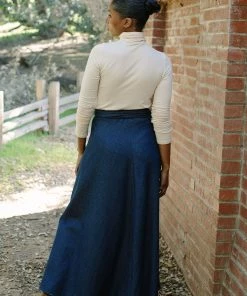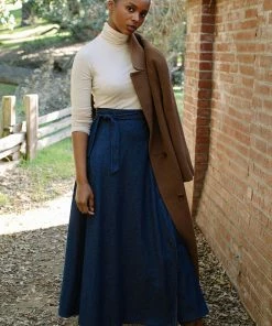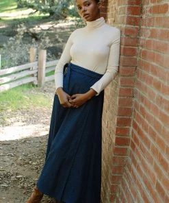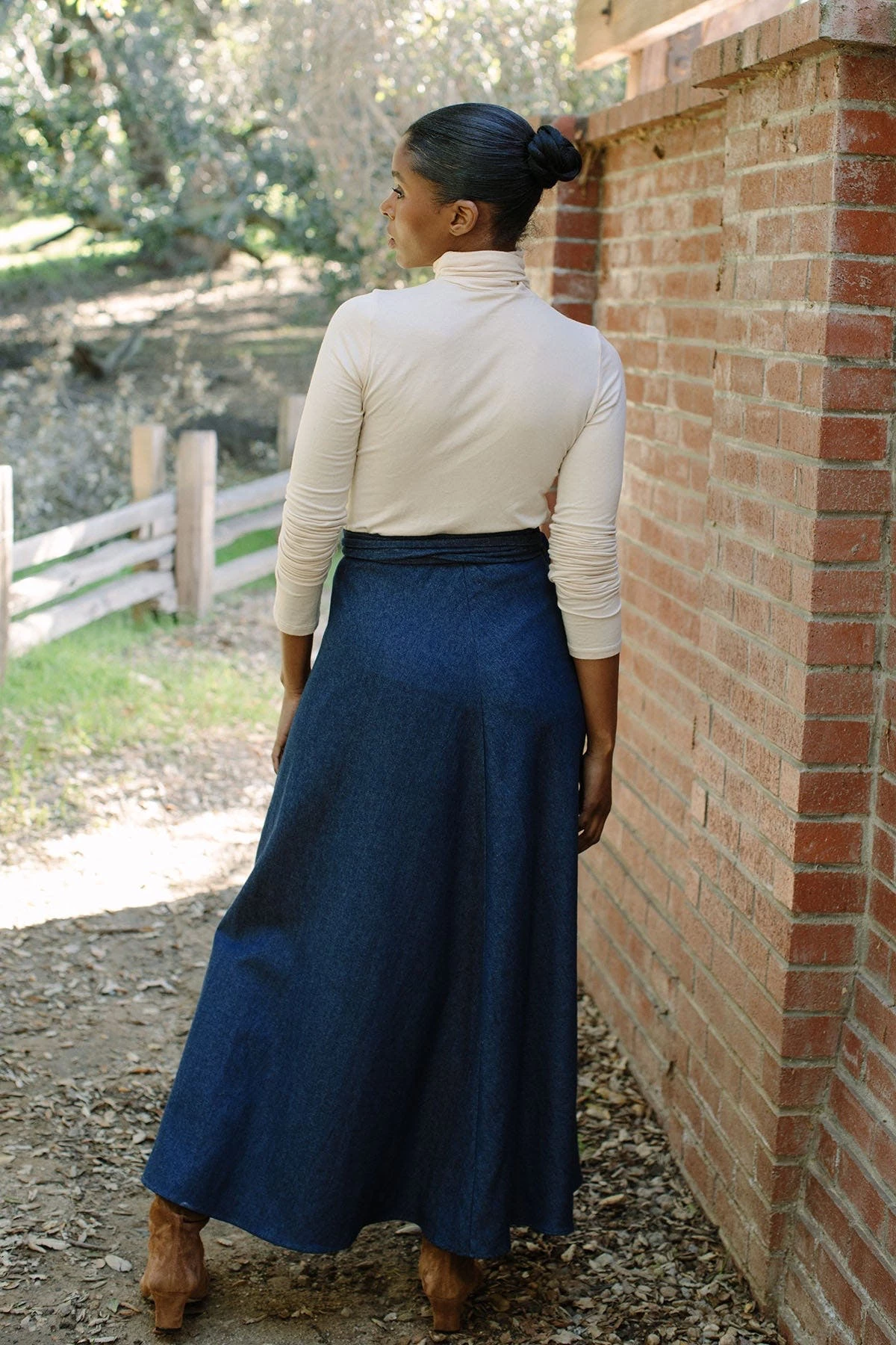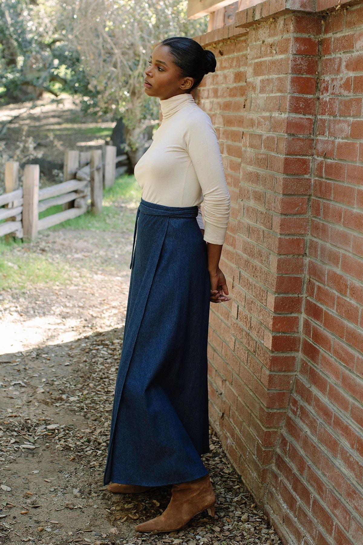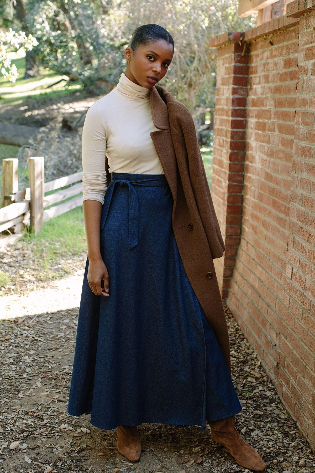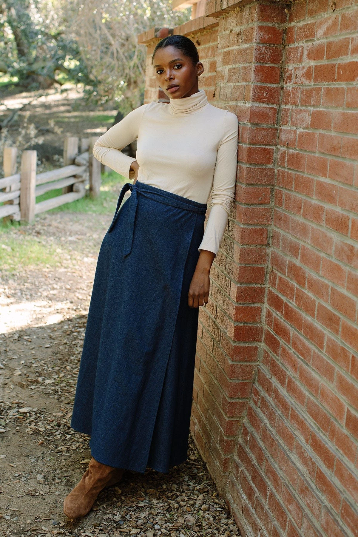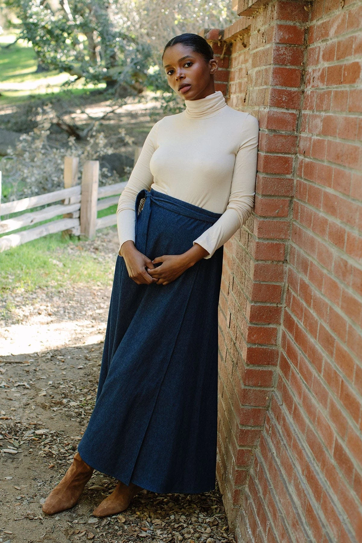 The Kelly Skirt is a classic long wrap skirt. Wear with the basic turtleneck or tuck in any of your favorite simple tops. Tie at your high waist for a feminine and flattering silhouette. It makes me feel like I’m channeling my mom and aunt in the 70s, in the best way.