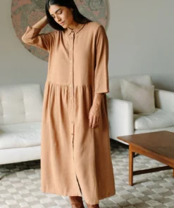 The leo dress is an oversized shirt-dress. This dress is equally chic with sandals or with loafers! They will wear it for cooler summer evenings and plan to bring it into fall with boots and leggings and a chunky cardigan. It is simple and classic.
