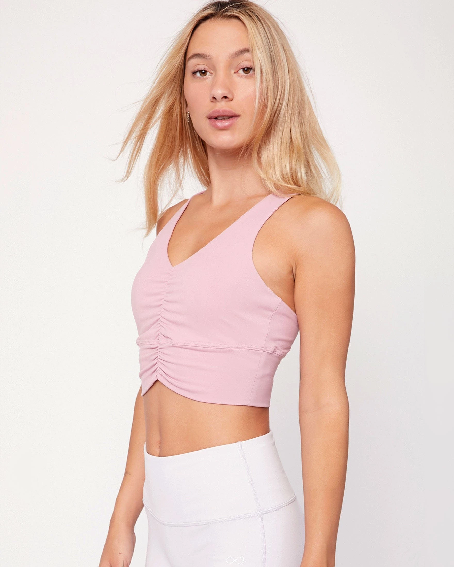 – New and trending shirring bra with a crop length- Flatterring V neck scoop, racerback and ruched detail at front. It’s great on its own or under a hoody- Armhole is made with a clean finish stitch so it doesn’t dig into your skin. Plus, say goodbye to tight bulging areas around chest and arms.- Must have from studio to street.- Vibrant Karma print motif.- Styled with Karma Sweatpant- Model is 5’7″, wearing size S