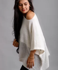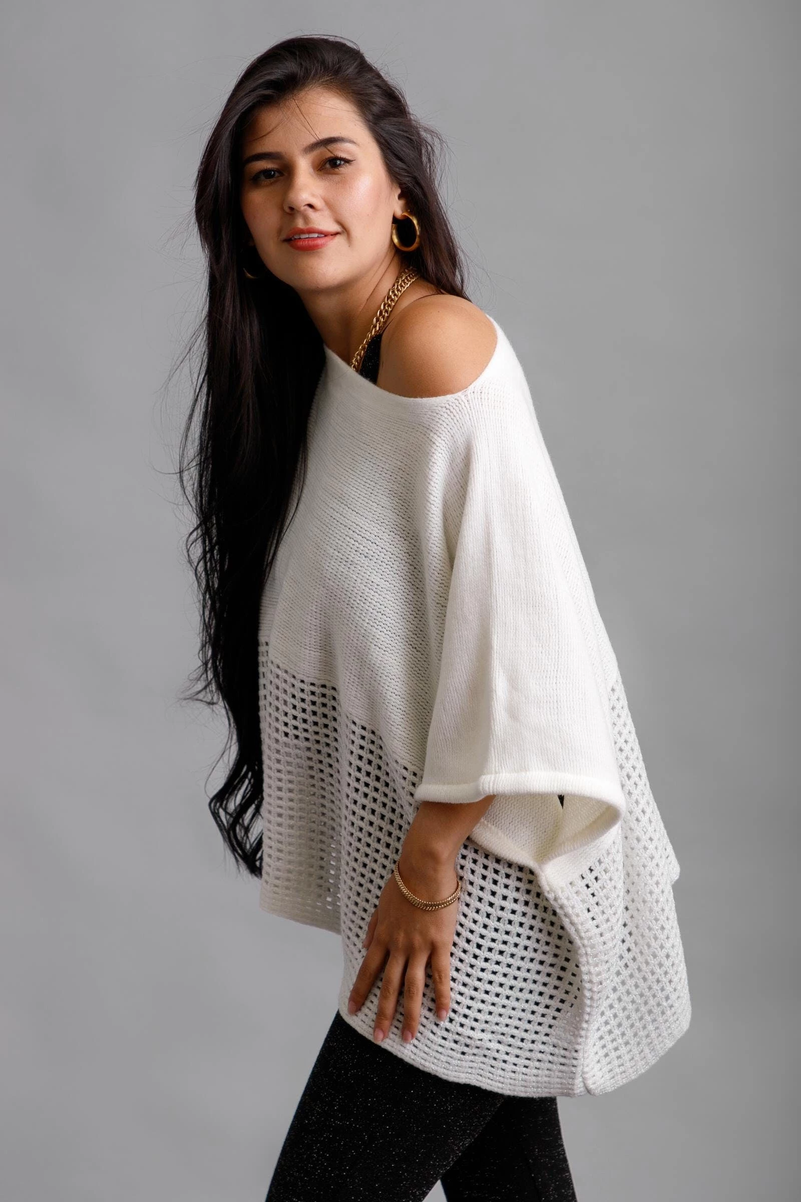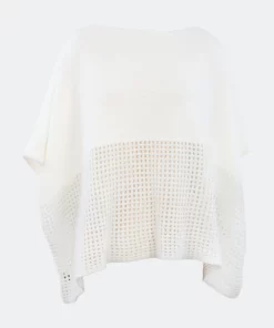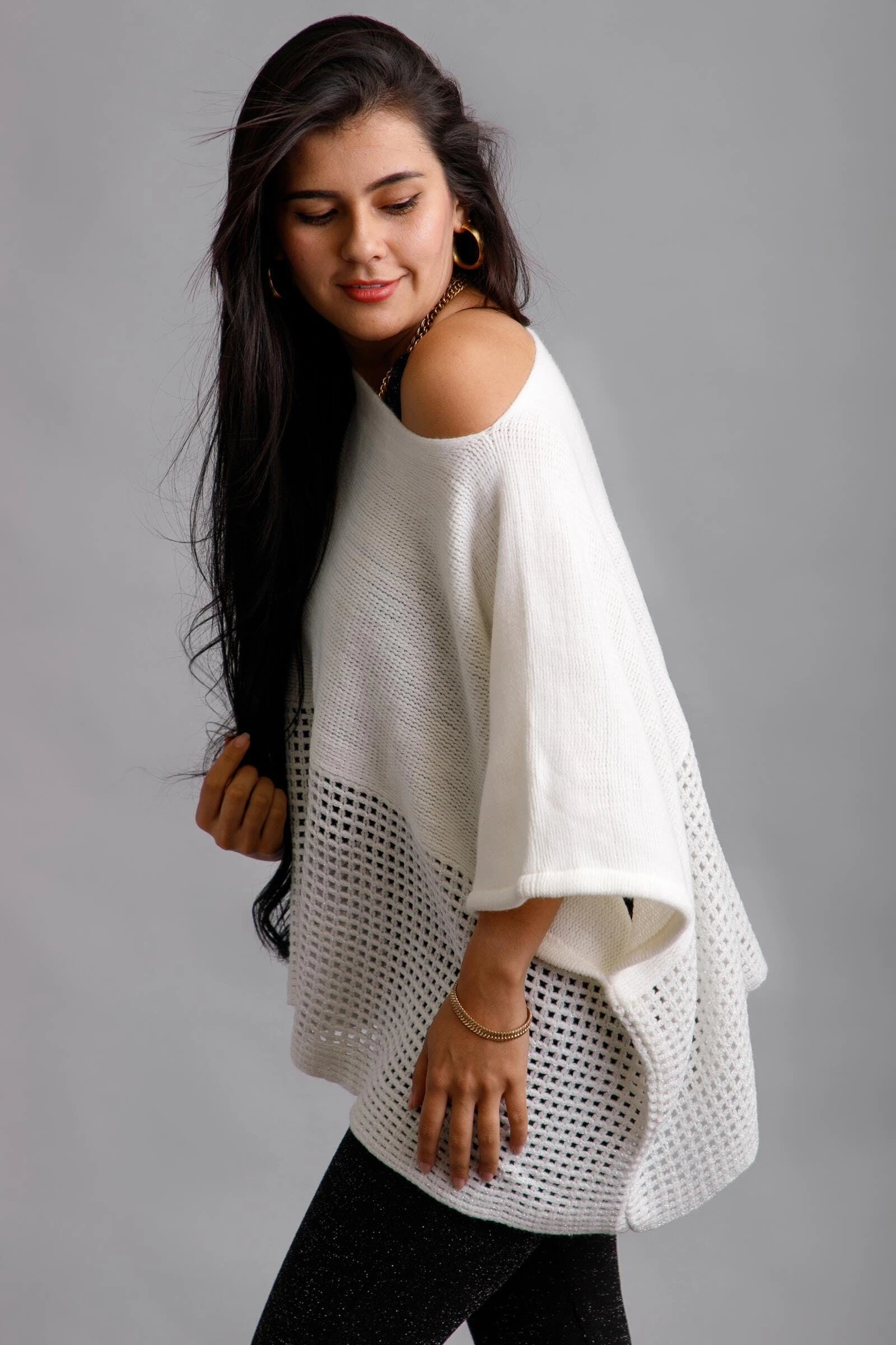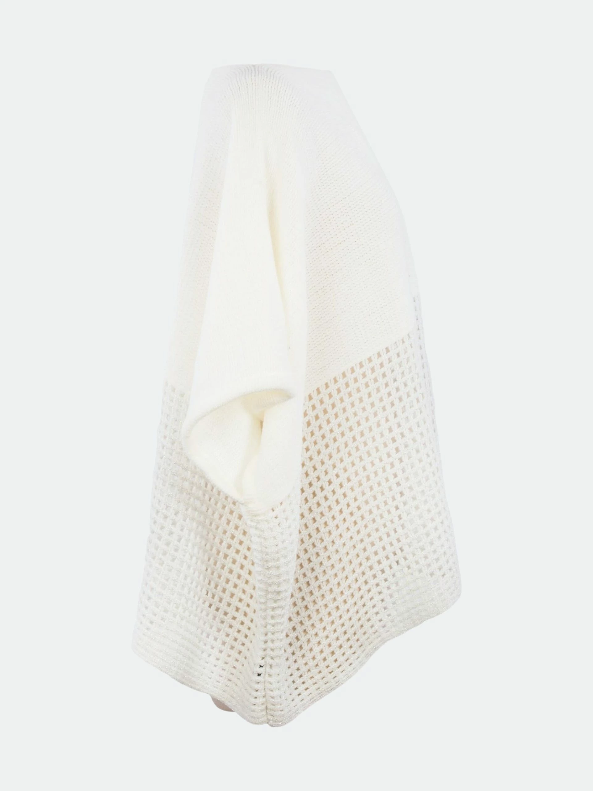 With a playful metallic weave and eyelet bottom, this roomy poncho is a lightweight and cozy addition to casual or dressy outfits.