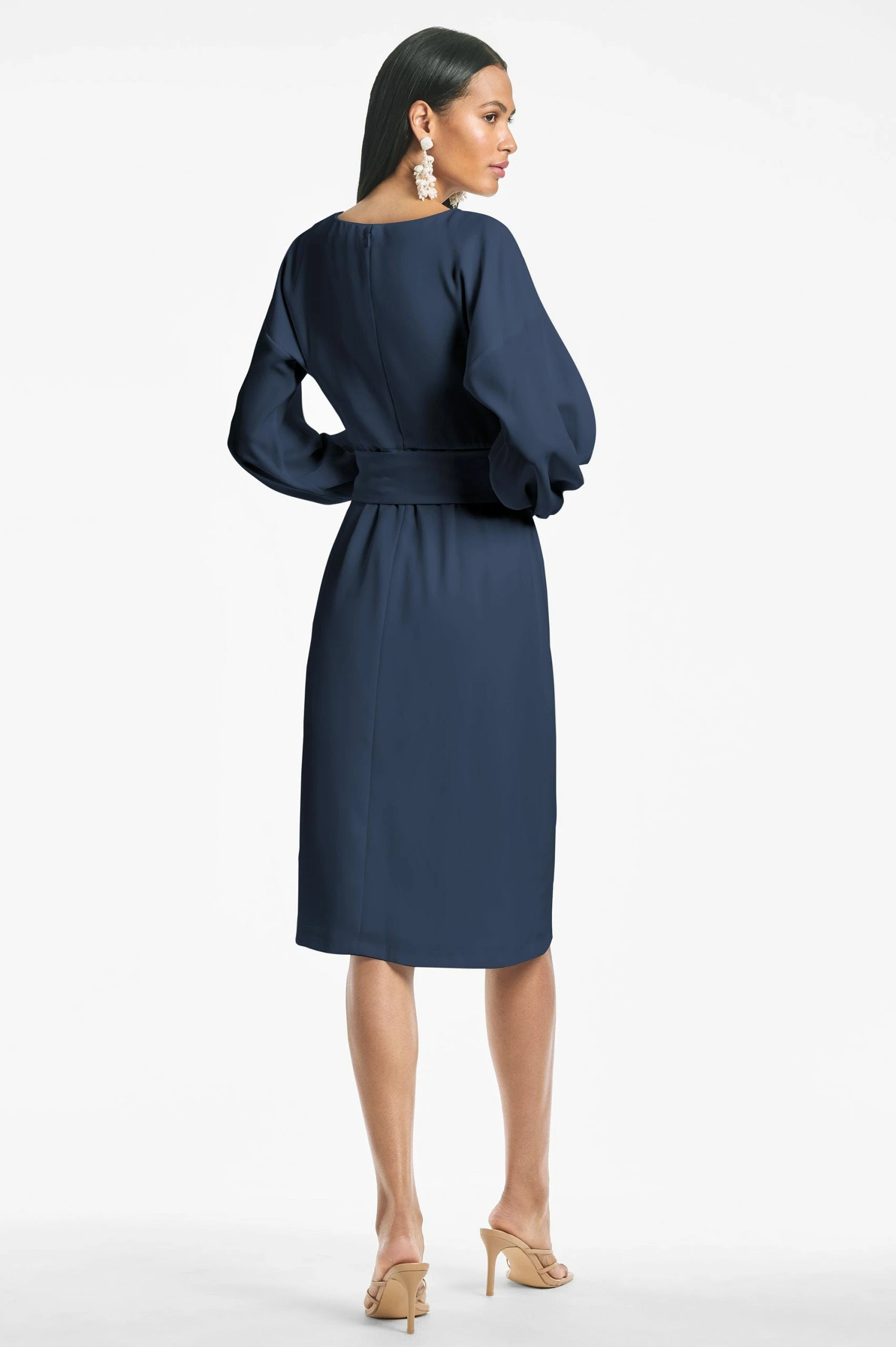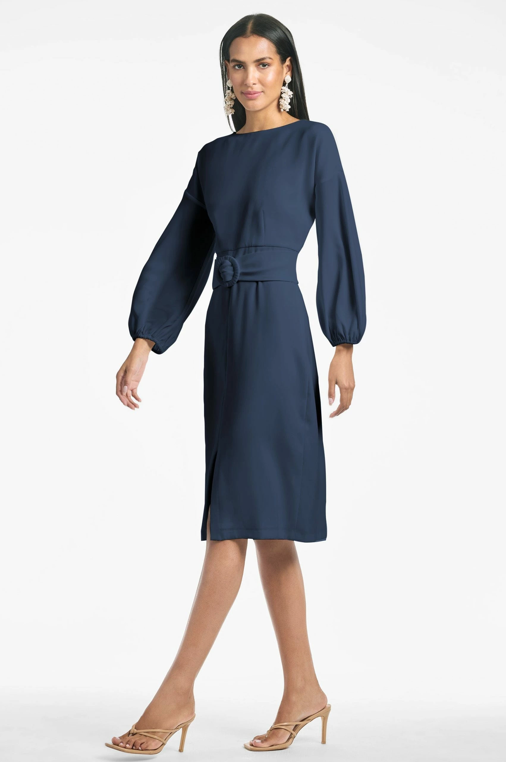 If ever there was a dress that could go anywhere it is Annie. The clean lines of this chic sheath are punctuated by an elegant and understated bracelet sleeve ruched at the cuff to create a subtle volume, center front slit and self-sash. The lightweight crepe drapes elegantly and is considered an ideal 3 season fabric.Sachin and Babi believe in celebrating every day, dressing with joy, and creating clothes that inspire beauty and confidence. Here’s to the moments make, and the moments that make us. Cheers.