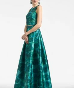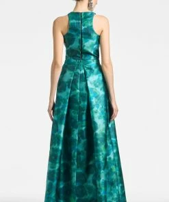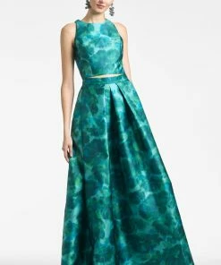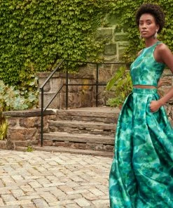 - Materials: – 46″ long- Back zipper- Printed mikadoModel Measurement:- Model is 5’10” wearing size 2