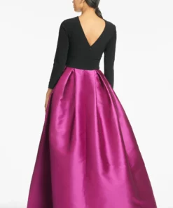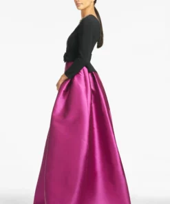 Elegant. Grande. Gorgeous. These are all the words that come to mind when they look at this classic ball down. What really love about this dress, which is everything, if they had to highlight something, it would be the bodice. The jet black top of this dress is in the “Magical” 4-way stretch crepe that flatters and hugs you while being incredibly comfortable. At the neck, a faceted bib necklace, and at the waist a self-tie sash. The skirt is a flash of intensely stunning color in Mikado.