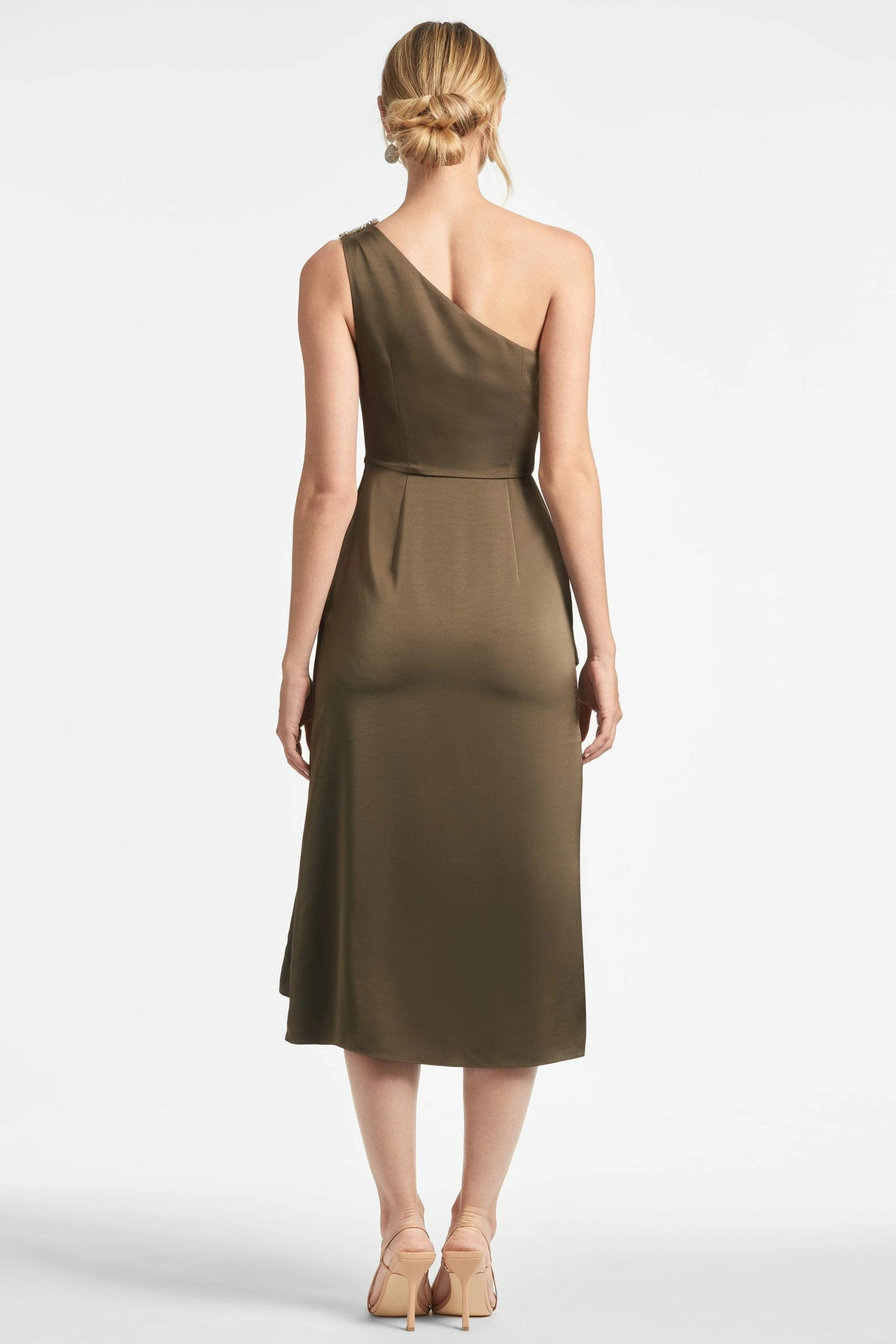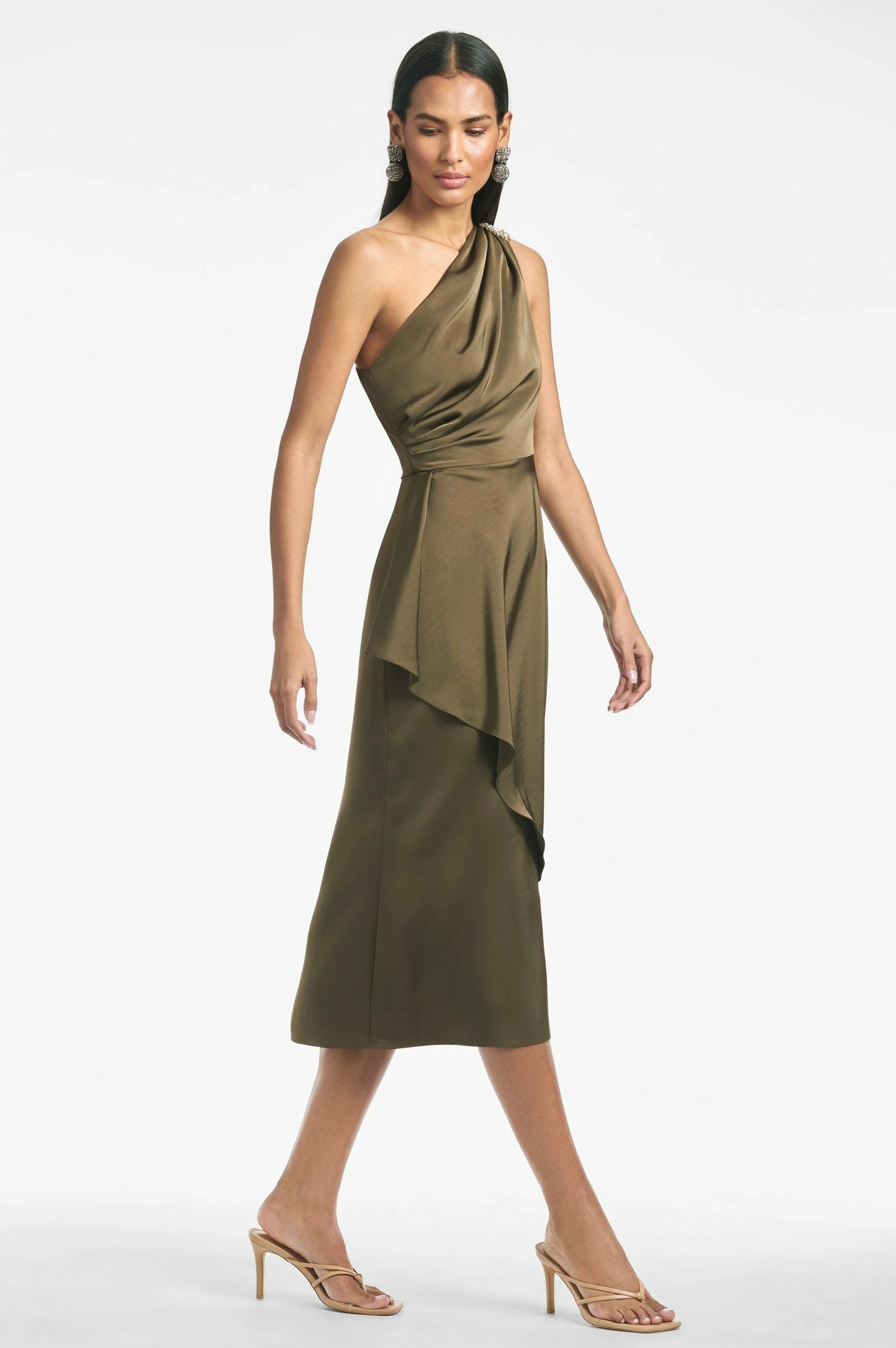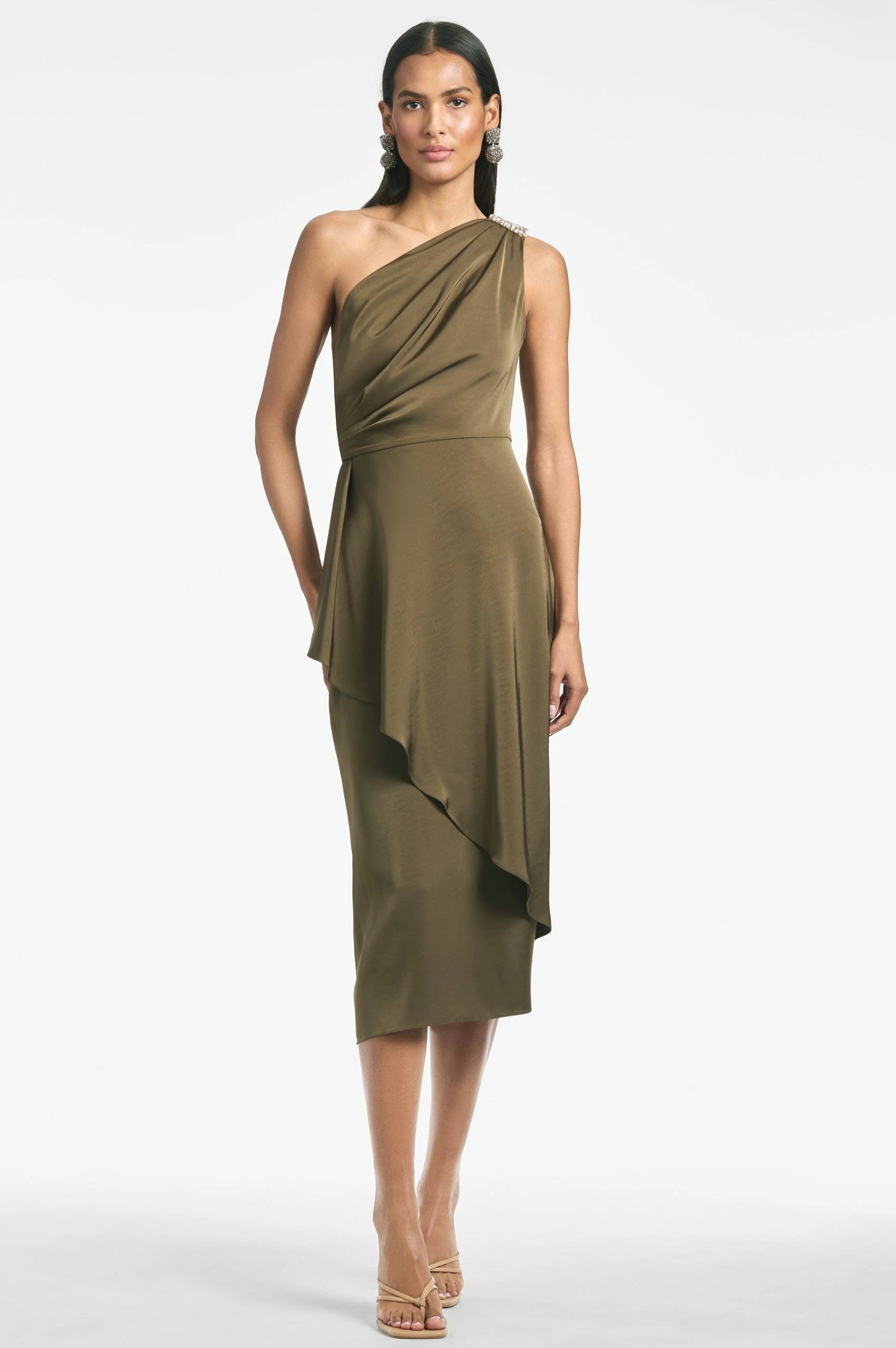 There is a bit of a Grecian influence to Evangeline. This dramatically draped, one shoulder with the crystal broach embellishments nips in at the waist and with an asymmetric overlay that falls effortlessly to an A-line. The color is a sophisticated, universal neutral that never goes out of style. Sachin and Babi believe in celebrating every day, dressing with joy, and creating clothes that inspire beauty and confidence. Here’s to the moments they make, and the moments that make us. Cheers.