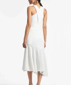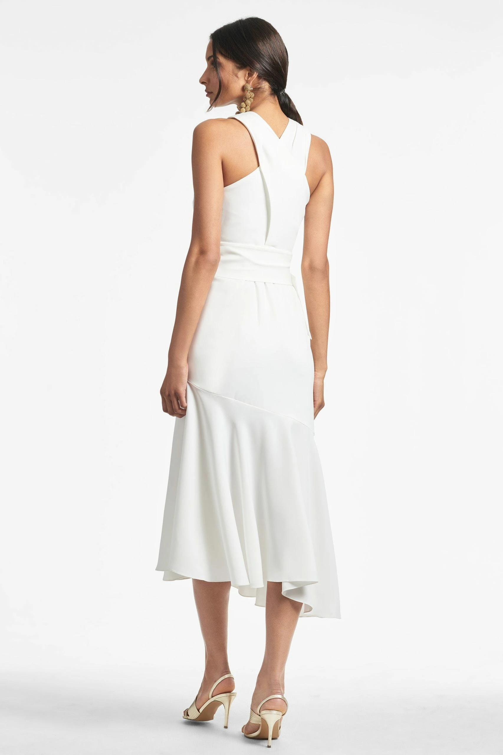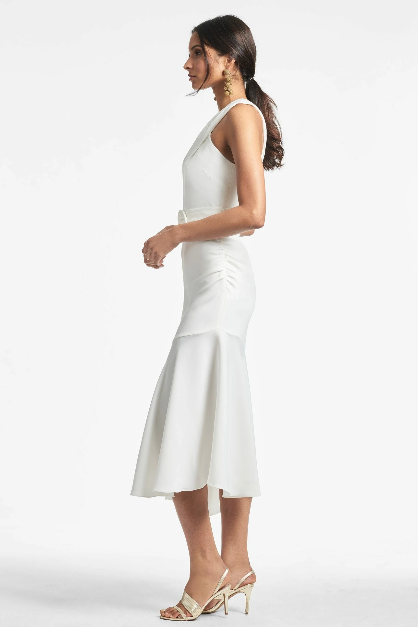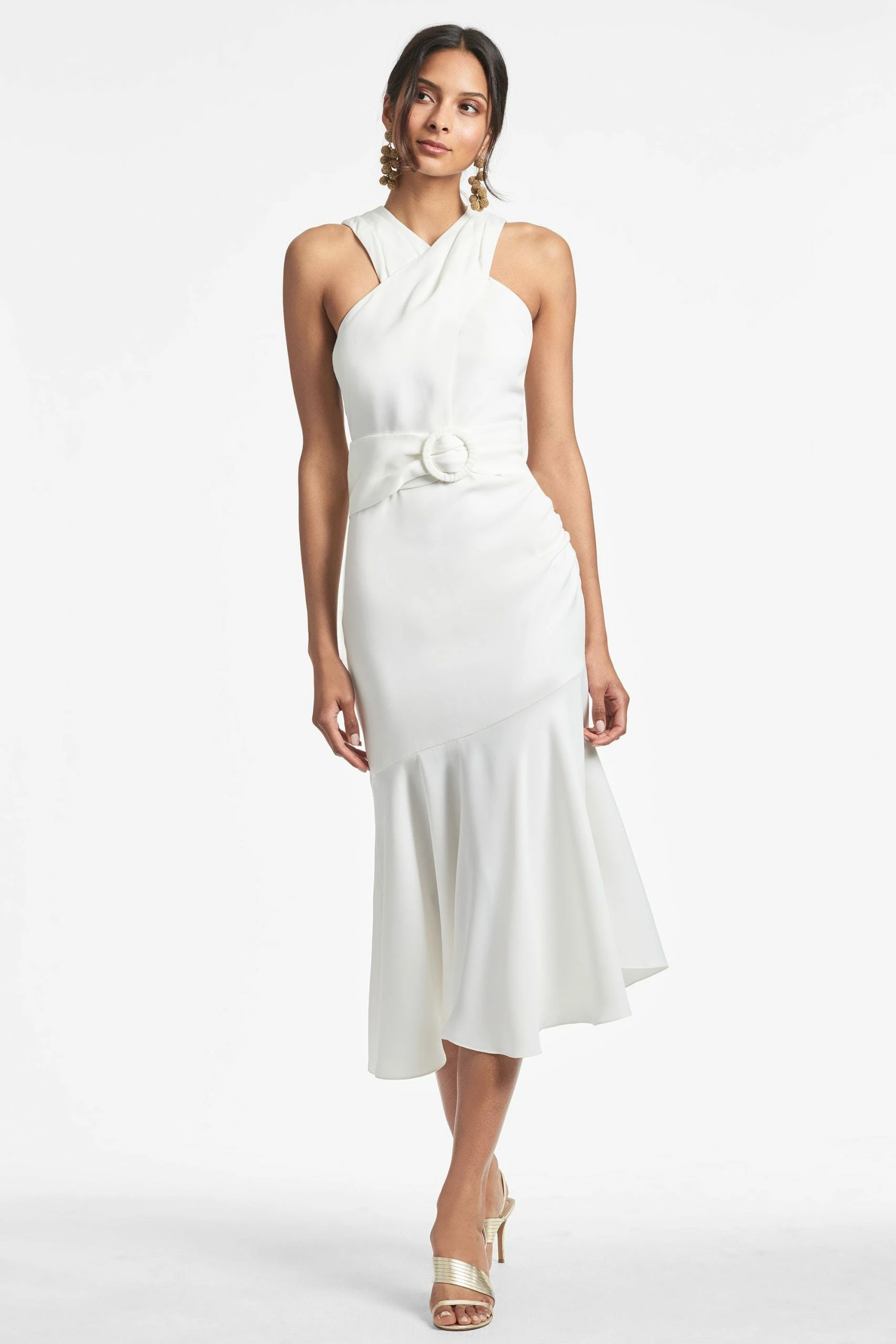 The Naomi dress in crepe is a modified mermaid silhouette in Ivory. The halter neckline opens up the decolletage creating a subtly elegant silhouette, ruching is also seen at the side to hug the hip, falling away from the body with a fluid asymmetric hem. The bodice features a self-belt with hand-wrapped buckle.Sachin and Babi believe in celebrating every day, dressing with joy, and creating clothes that inspire beauty and confidence. Here’s to the moments we make, and the moments that make us. Cheers!