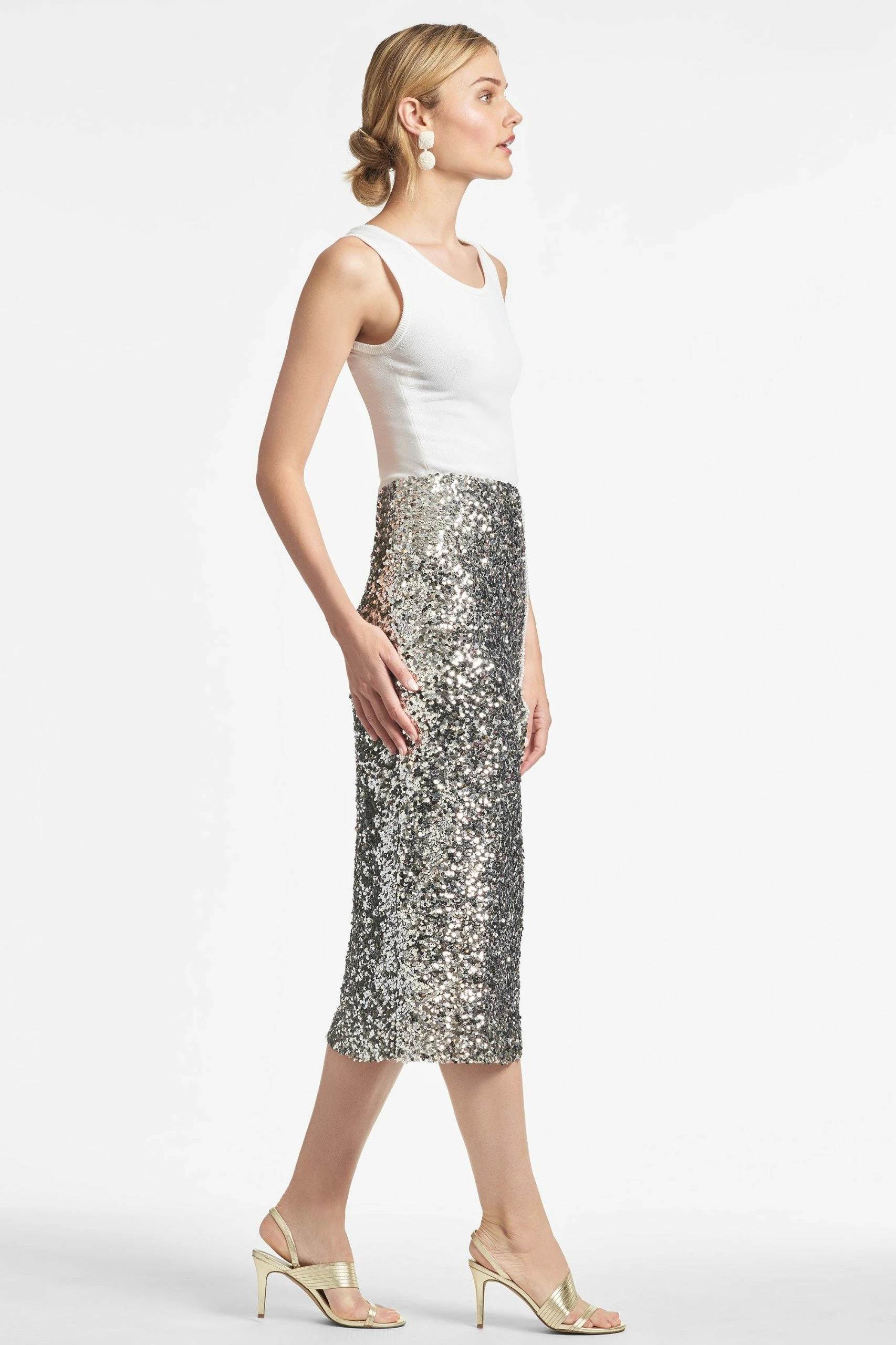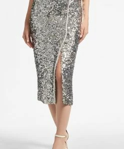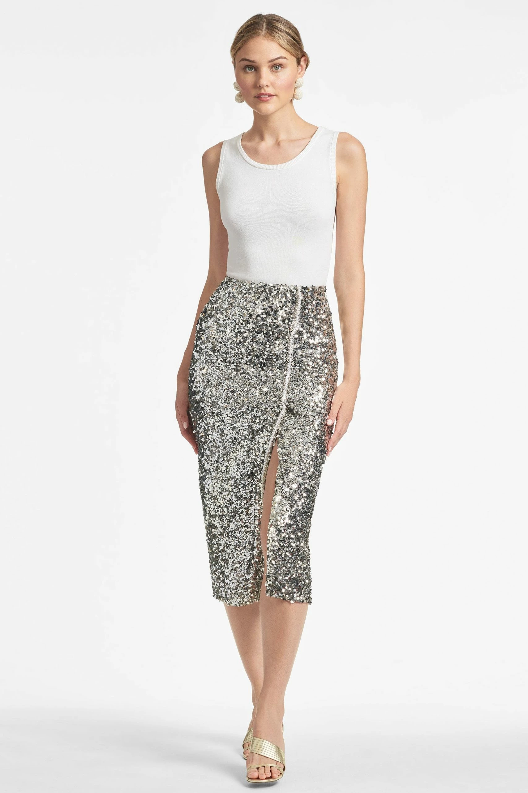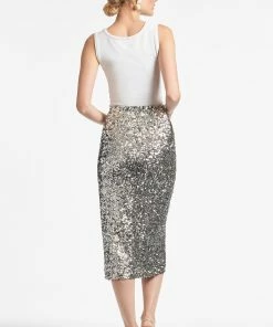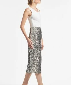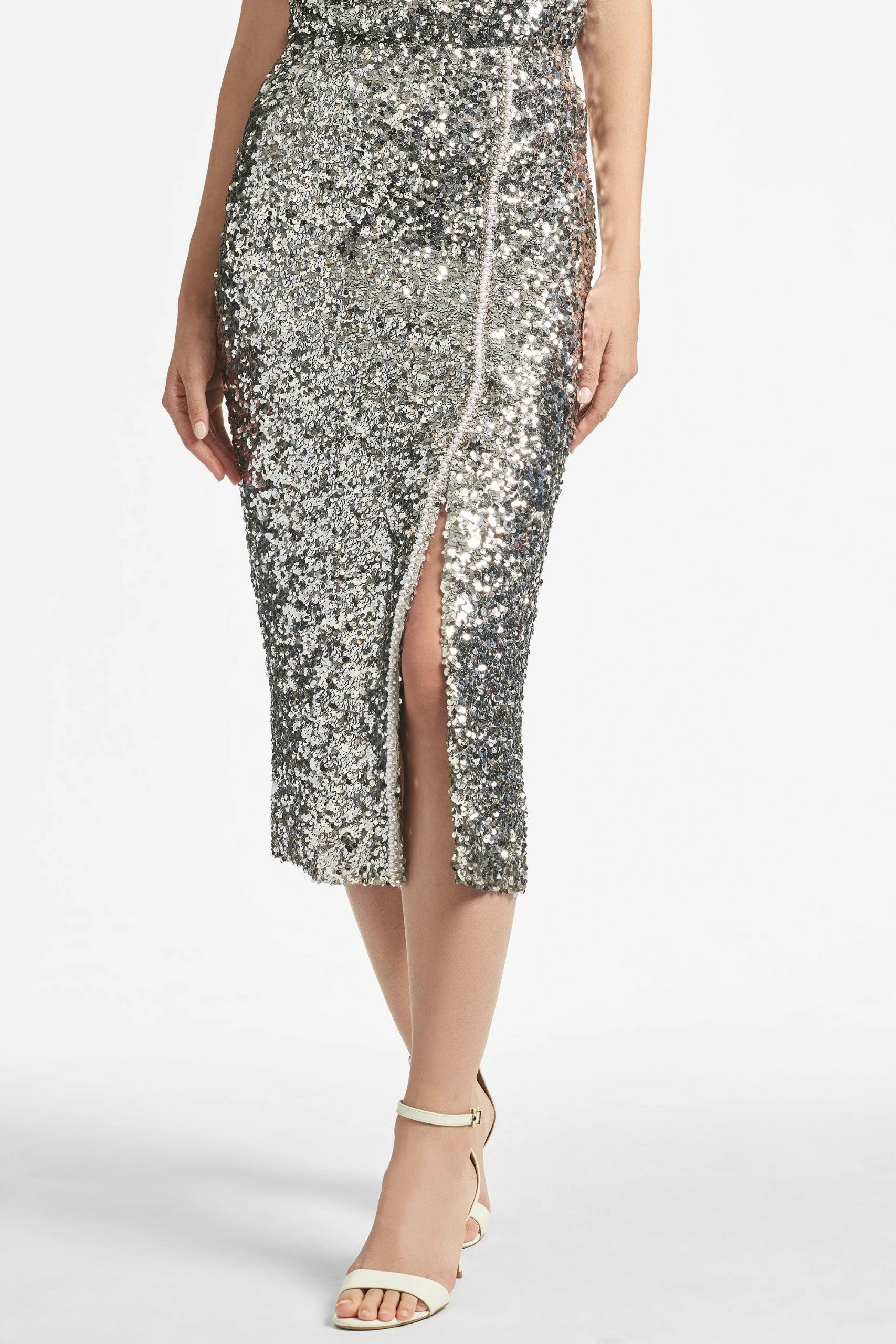 Sachin & Babi silver, stretch sequin skirt (say that 3 times fast) is bound to be a showstopping staple for seasons to come. A classic pencil skirt shape has a line of perfectly matched faux pearls that run up its side slit and travel all the way to the invisible waist.Sachin and Babi believe in celebrating every day, dressing with joy and creating clothes that inspire beauty and confidence. Here’s to the moments make and the moments that make us.