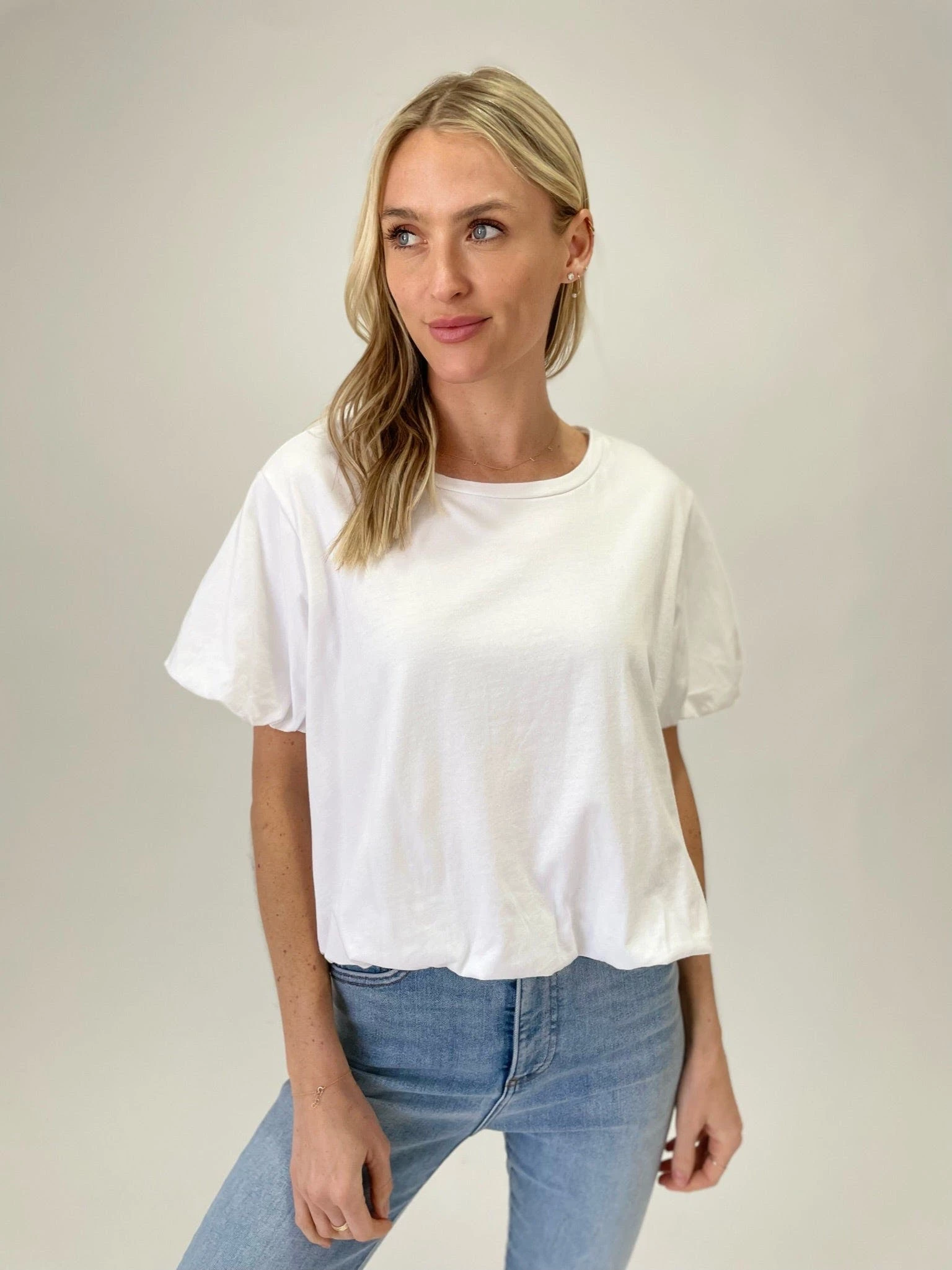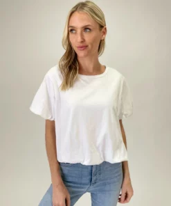 This bubble tee has a faux crop and detailing at the sleeves and bottom. Perfect to wear with high waisted denim for a fun look.