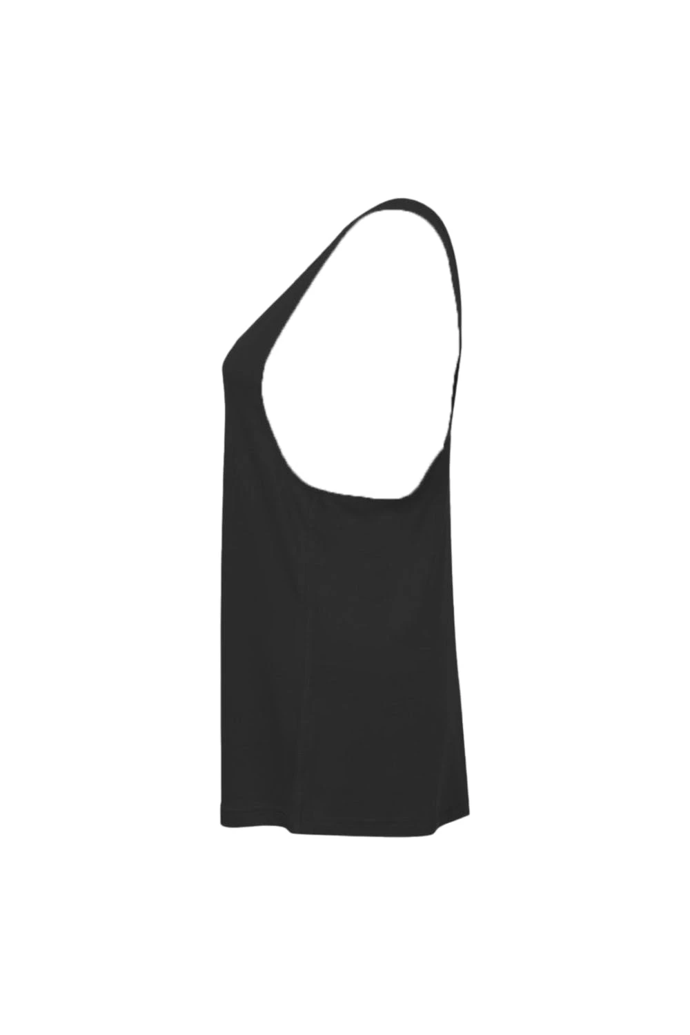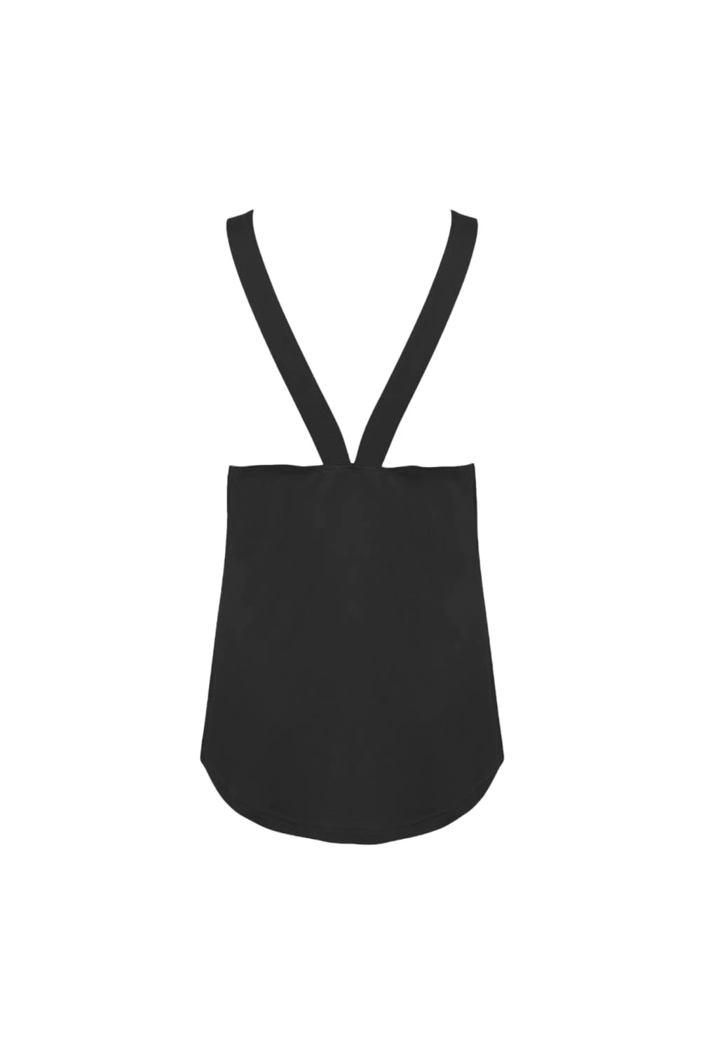 – Tear-out label.- Strappy back, drop armhole and hem.- Flatlock stitching.- Scoop neckline.