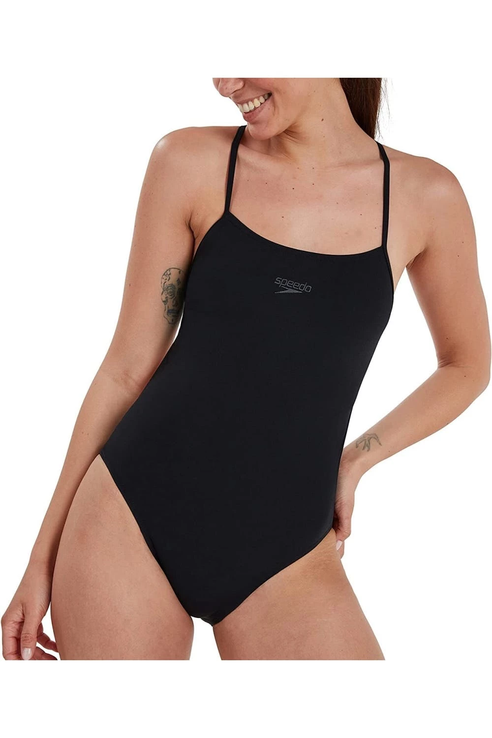 – Material: Recycled Materials- Fabric: Endurance+- Design: Logo, Plain- Neckline: Collarless- Back Style: Open- Fastening: Pull-On- Chlorine Resistant, Flexible, High Cut Leg- Thin Strap- Fabric Technology: Quick Dry