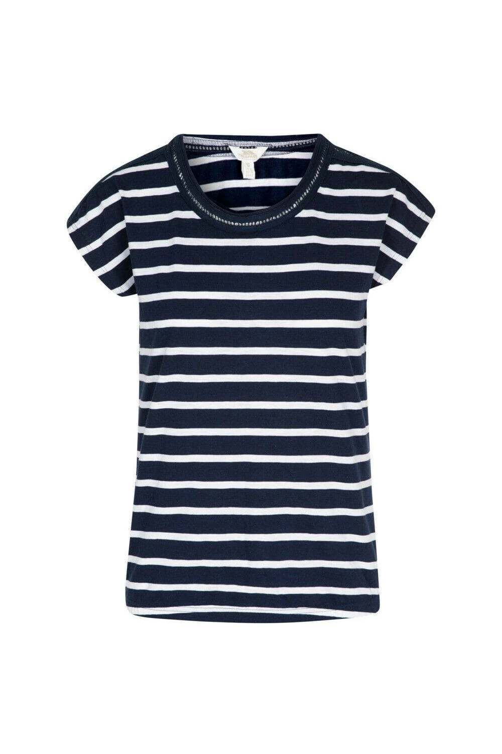 – Grown on sleeve with lace trim- Scoop neck with faggotted neck trim- Bubble hem- Yarn dyed Stripe