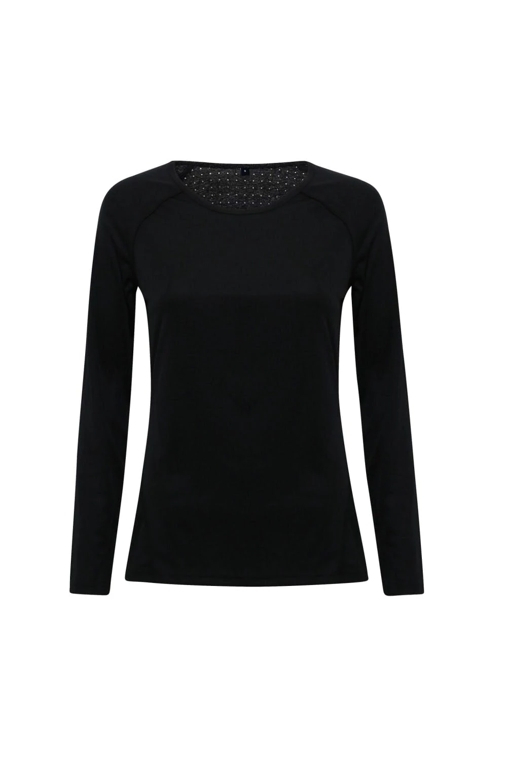 – Stretch top.- Twin needle stitch on hem.- Contrast stitch.- Round neck.- Long sleeves.- Strategic lazer cut to enhance breathability.- Materials: 90% Polyester, 10% Elastane.- 180 gsm..- Gender: Women