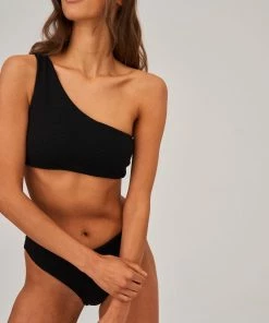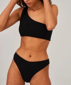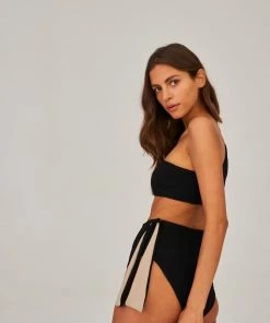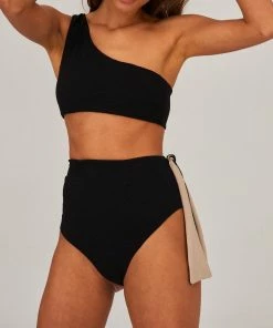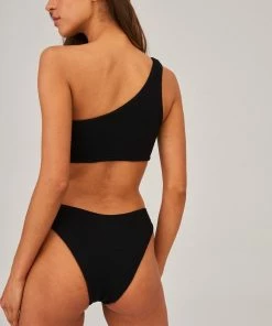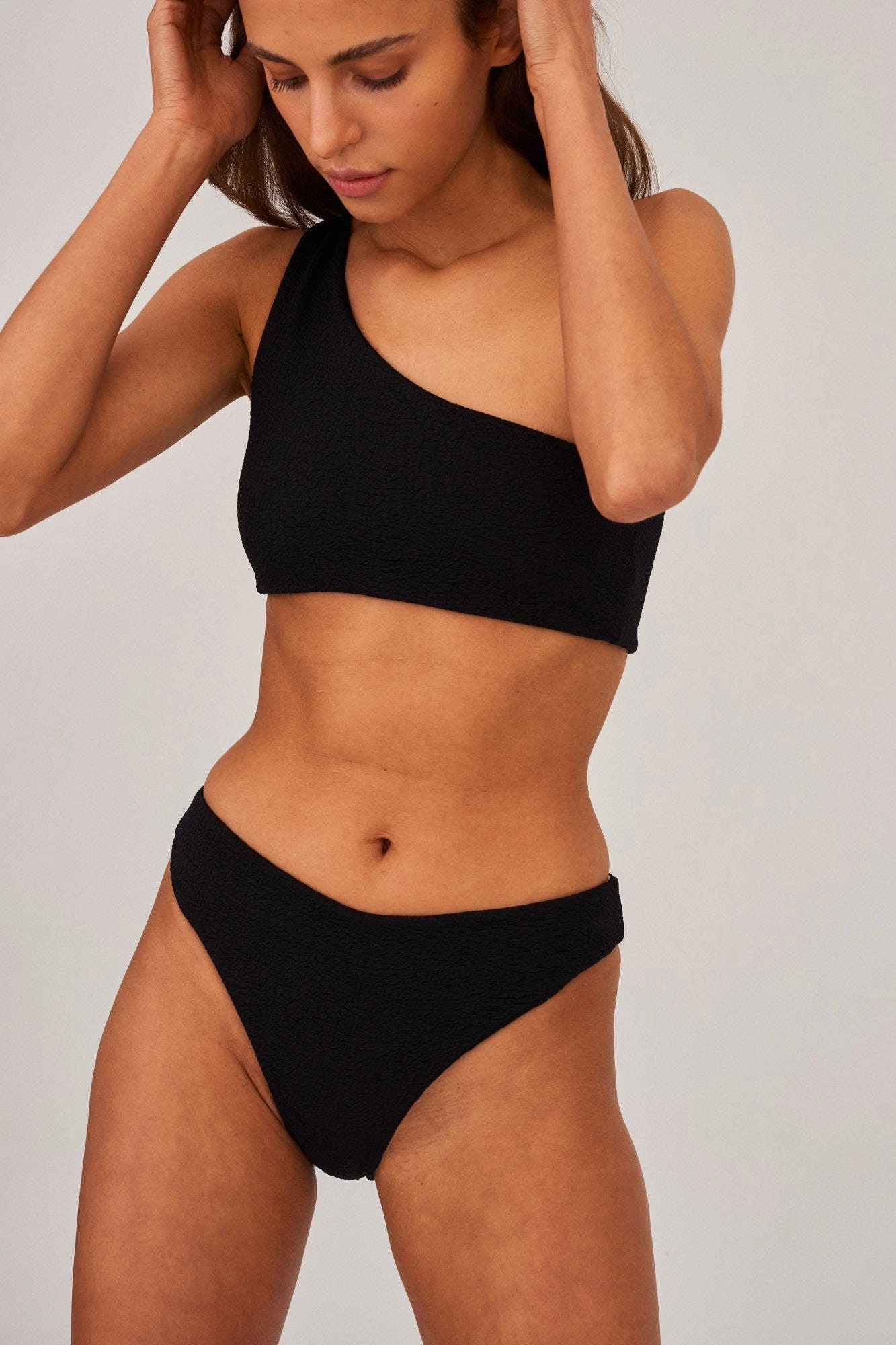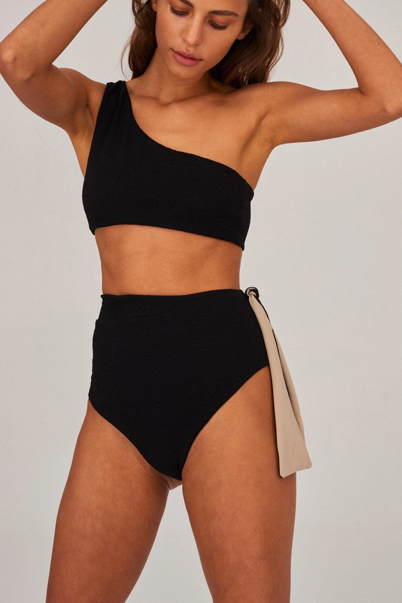 – The set is asymmetrical, high-waisted briefs slightly slim the figure
