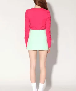 – Elastic ruching on long sleeves with wide fitted cuff
