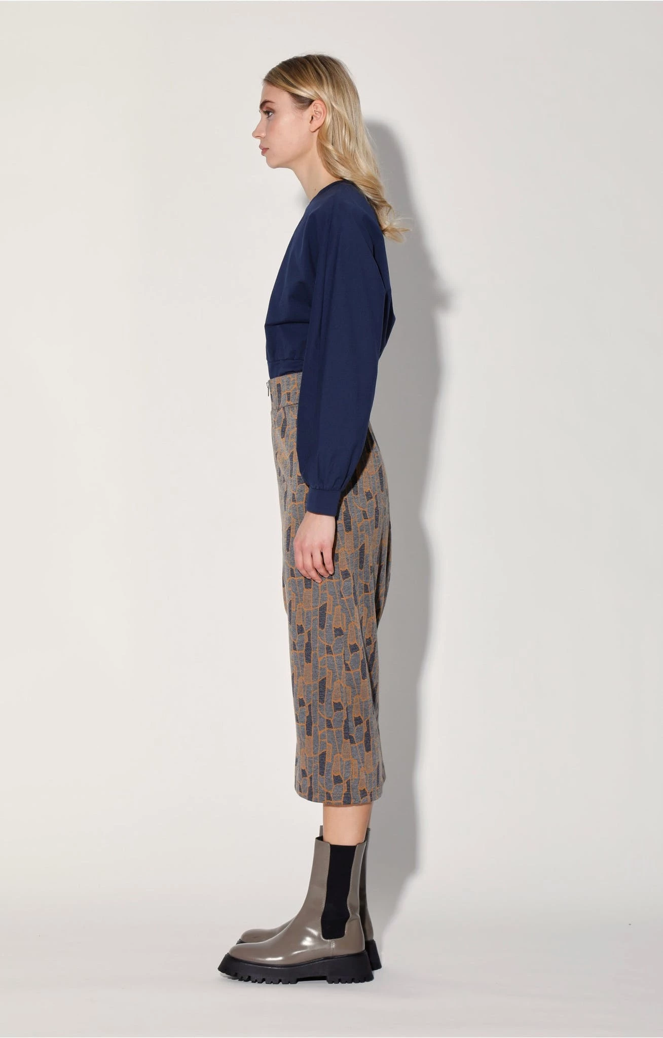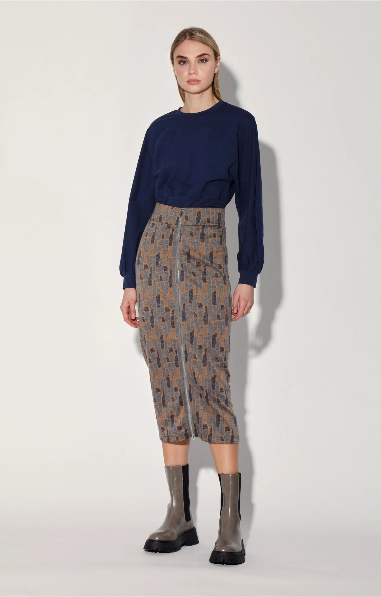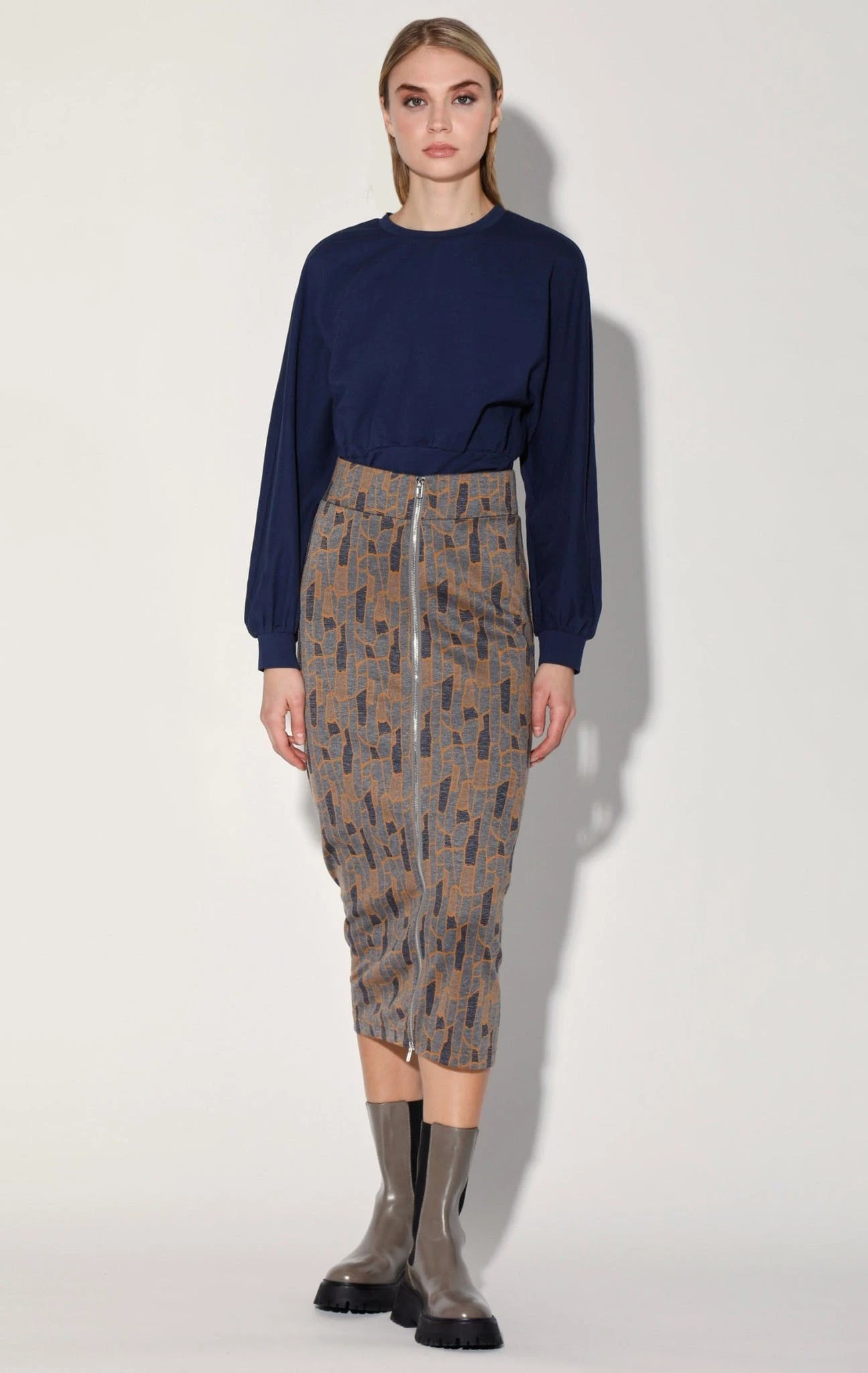 An effortless midi skirt, the Ruthie Skirt is a fun patterned knit style with edgy front exposed zipper detail.