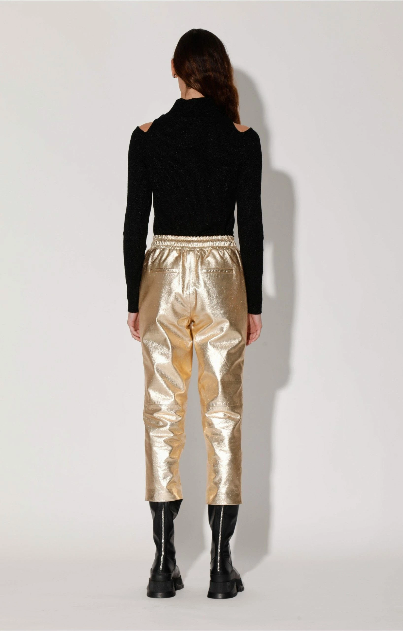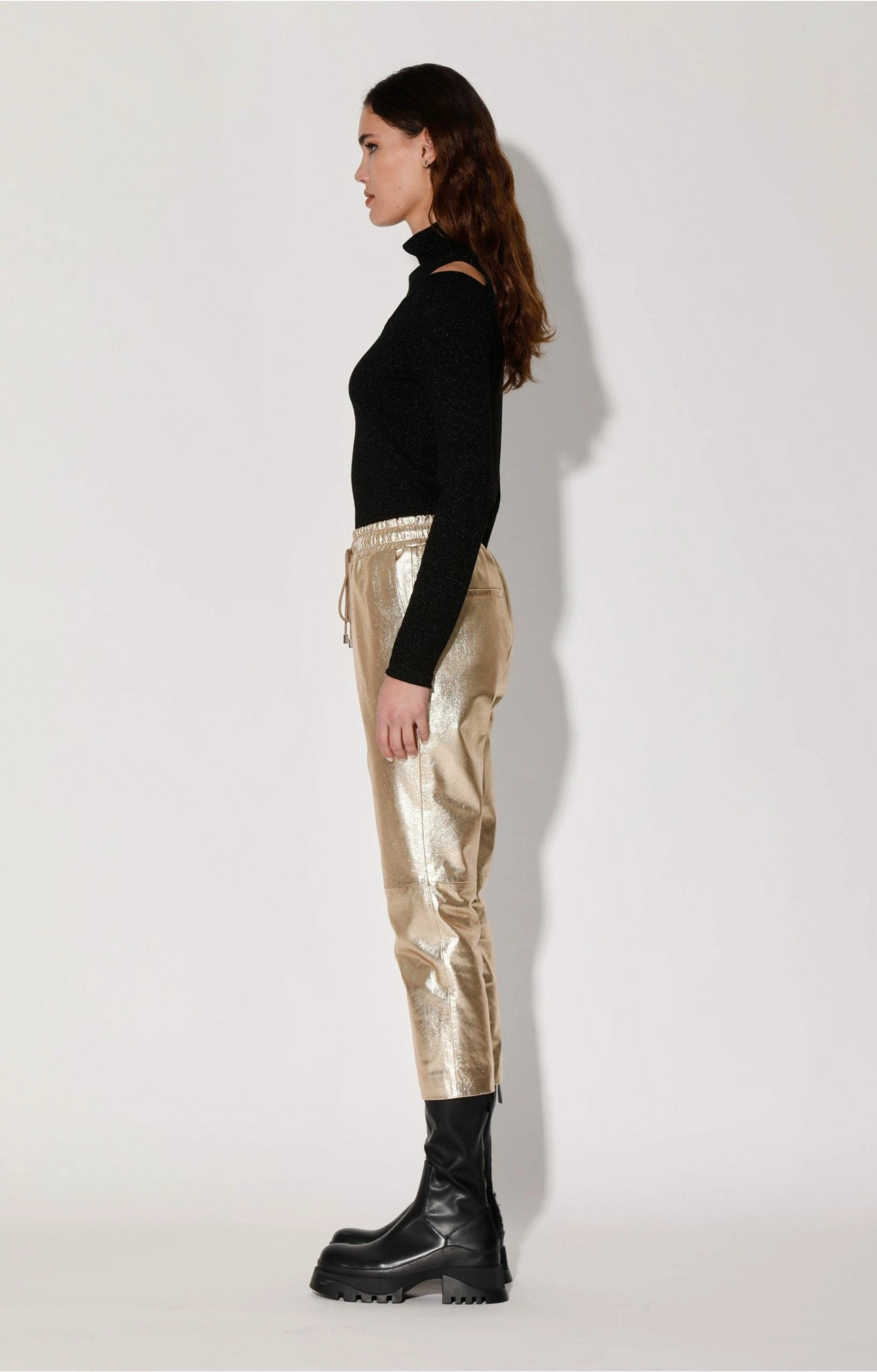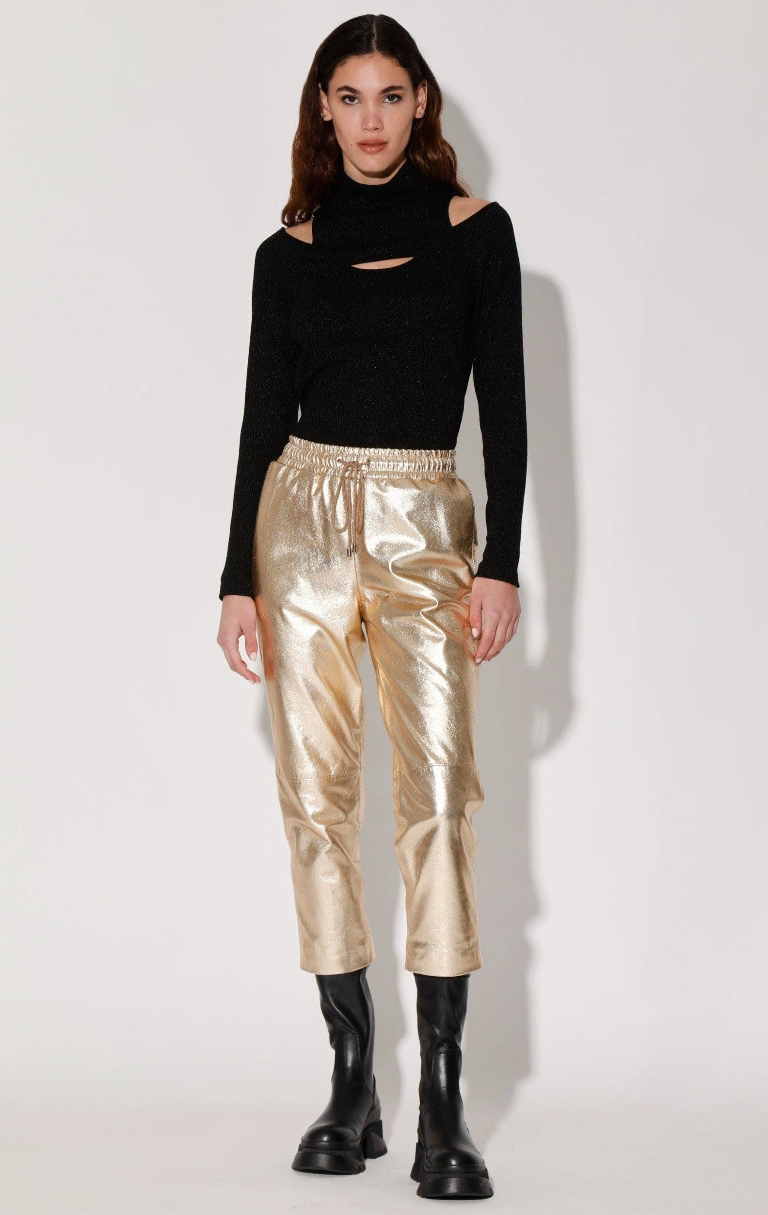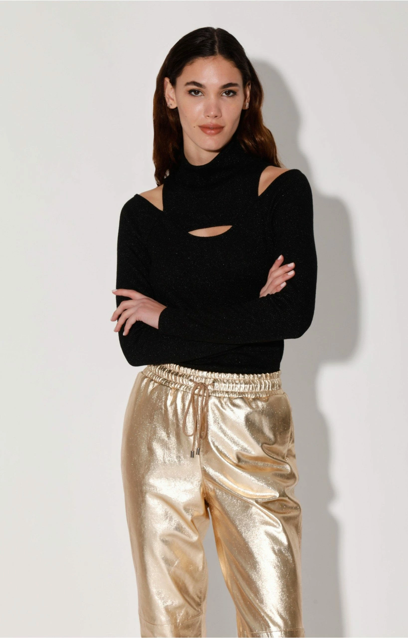 Great to pair back to the leather bottoms is the Tula Top. Featuring a mock neck and cut outs at the neck and shoulder it shows off some skin in a subtle way.