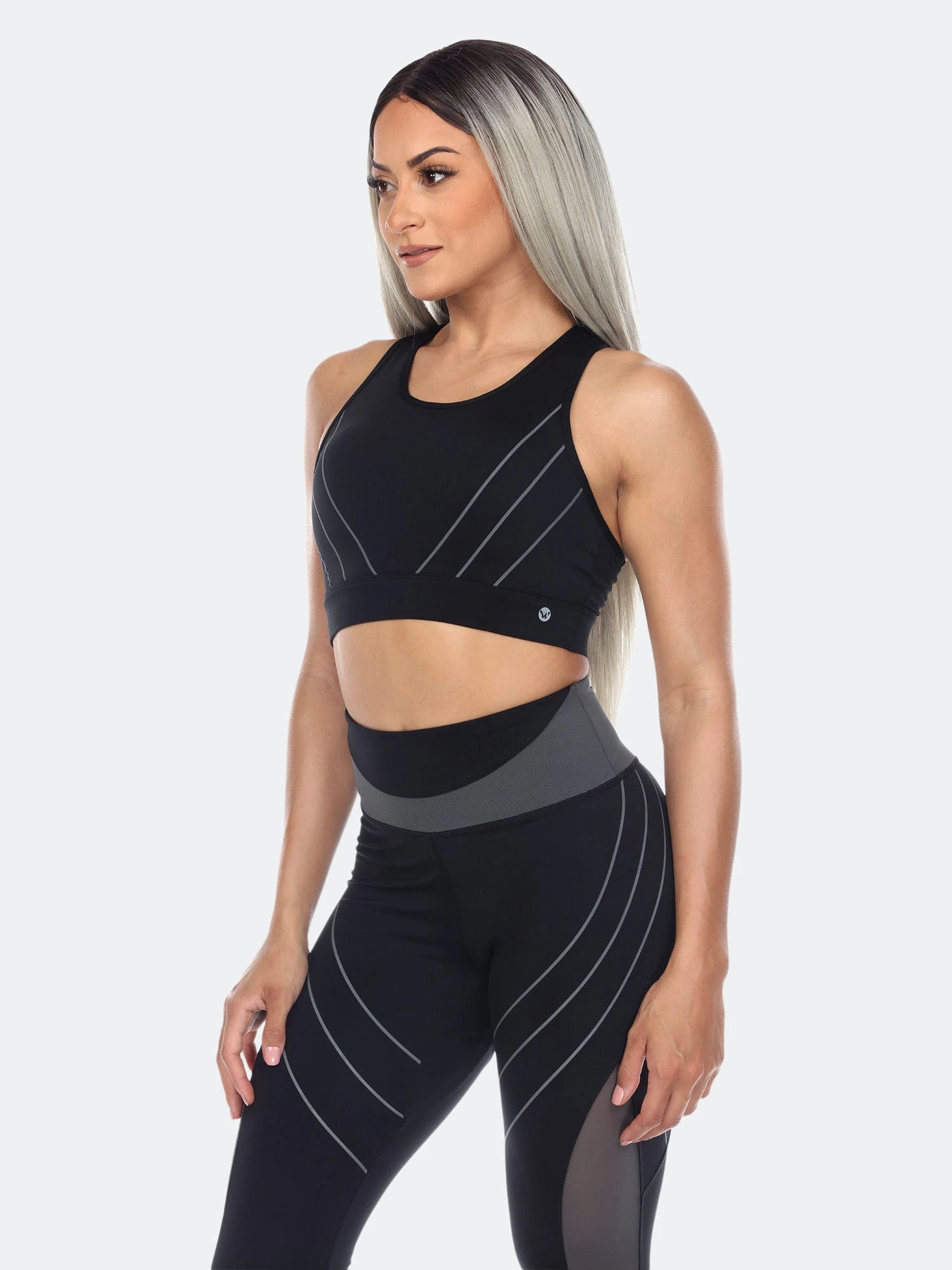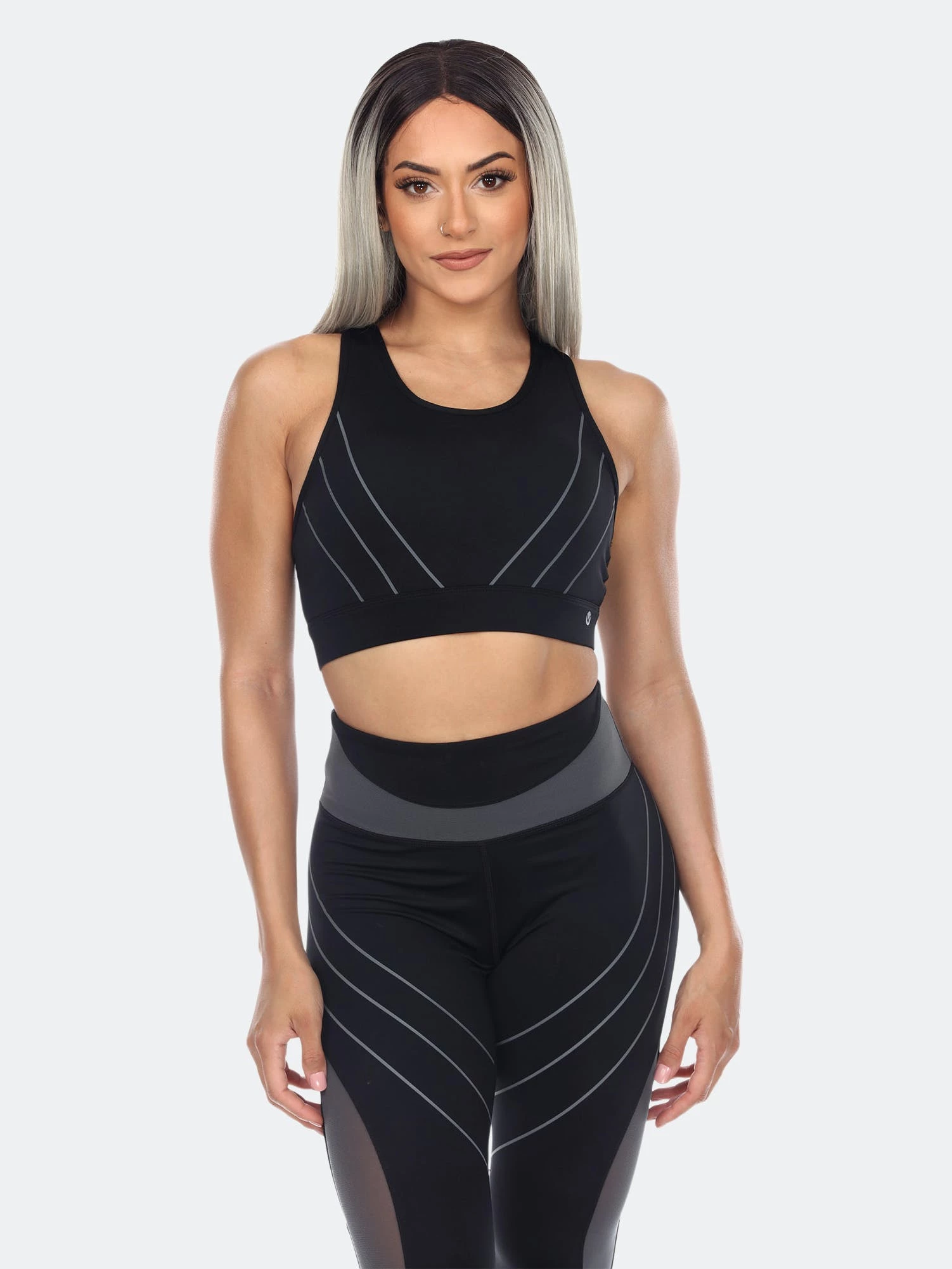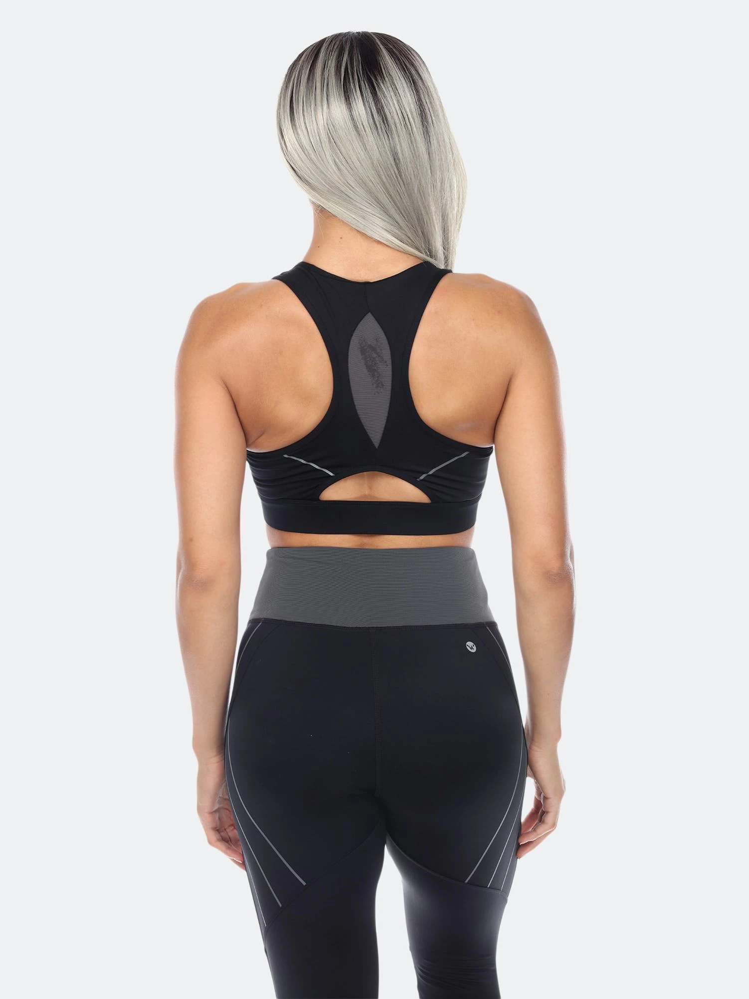 A lycra sports bra featuring a mesh and peek-a-boo cut out back, distinctive piping, and a scoop neckline for comfort and detail. Enjoy a good workout in our breathable and extra supportive padded sports bra.