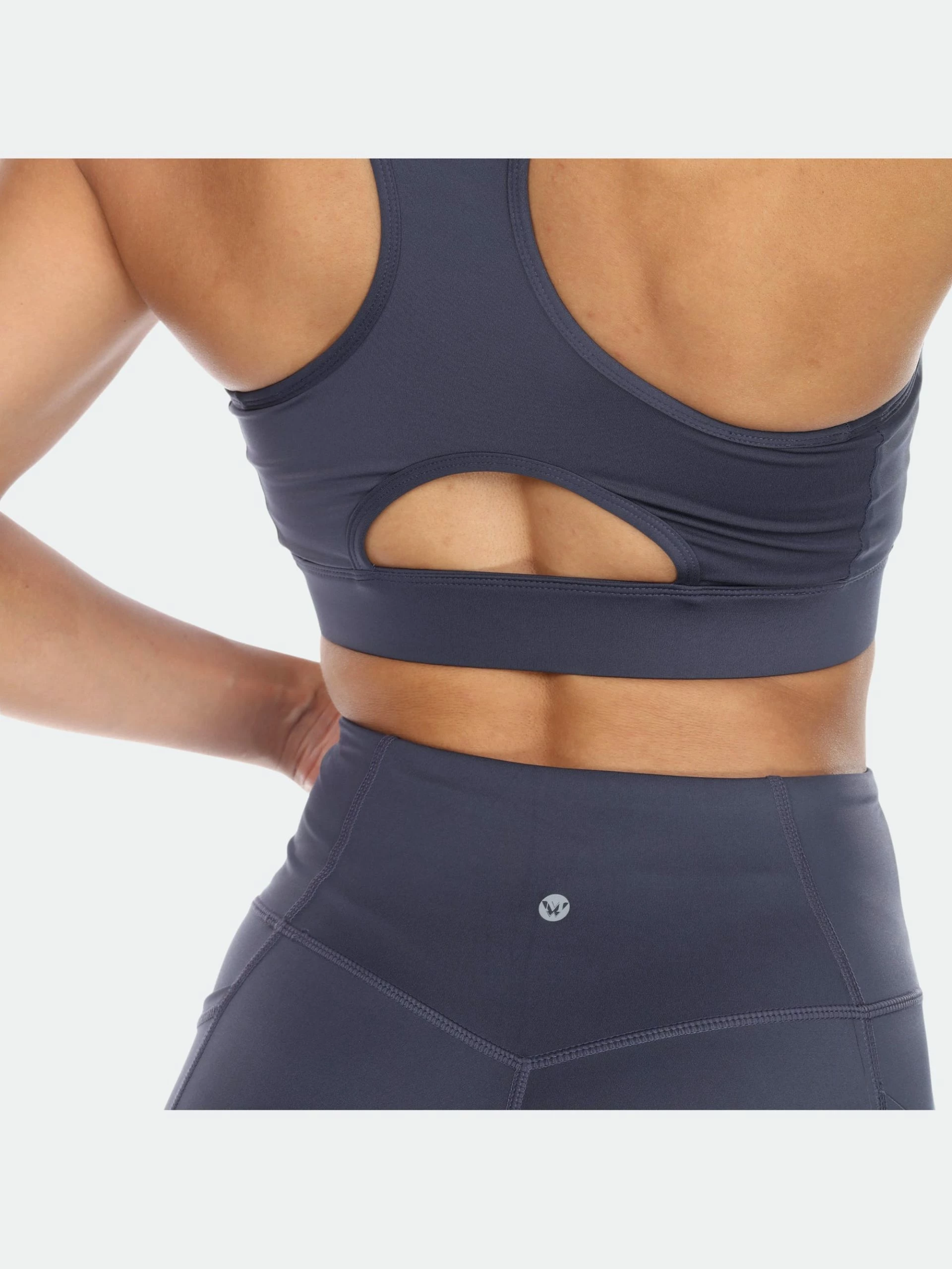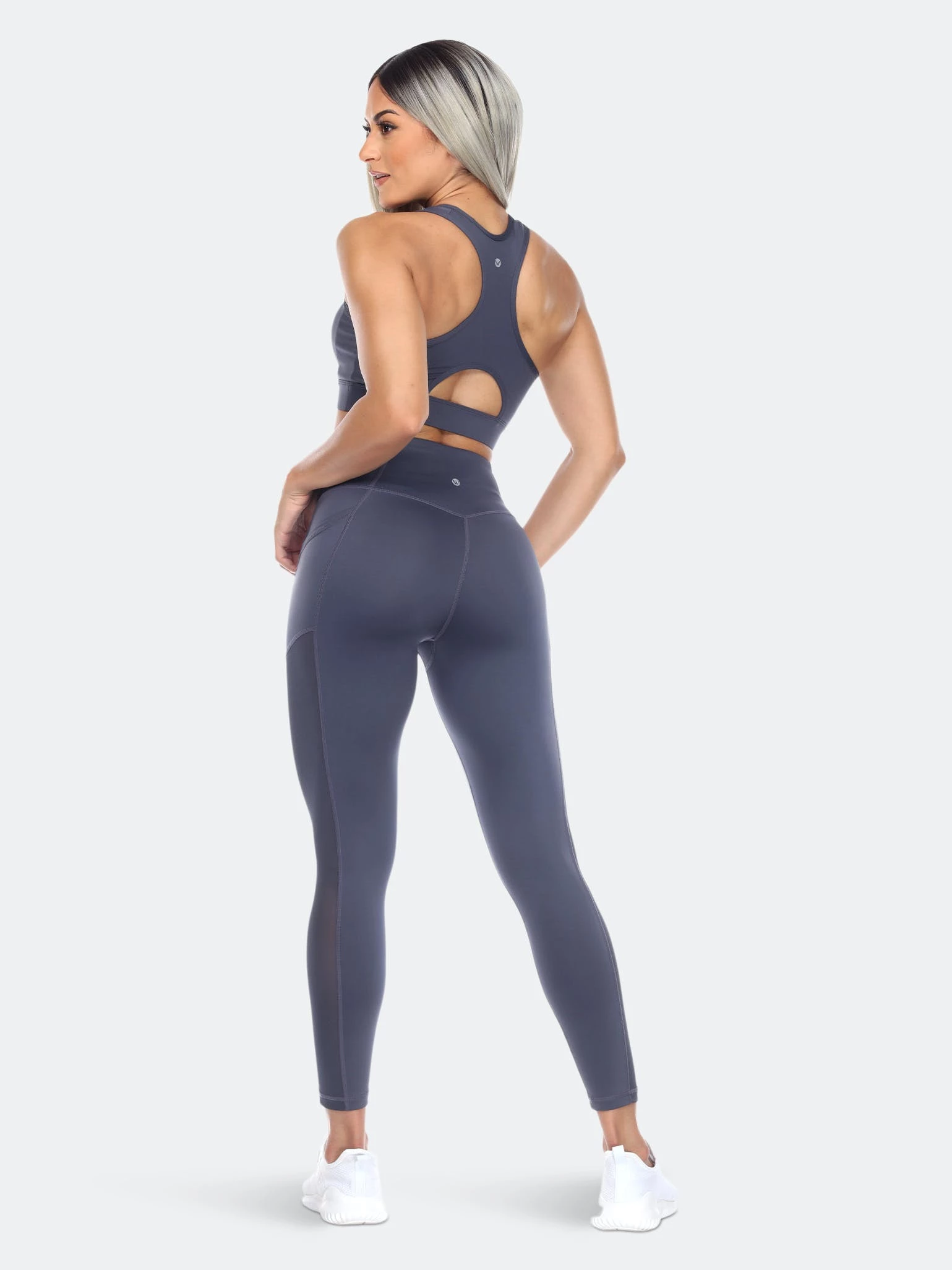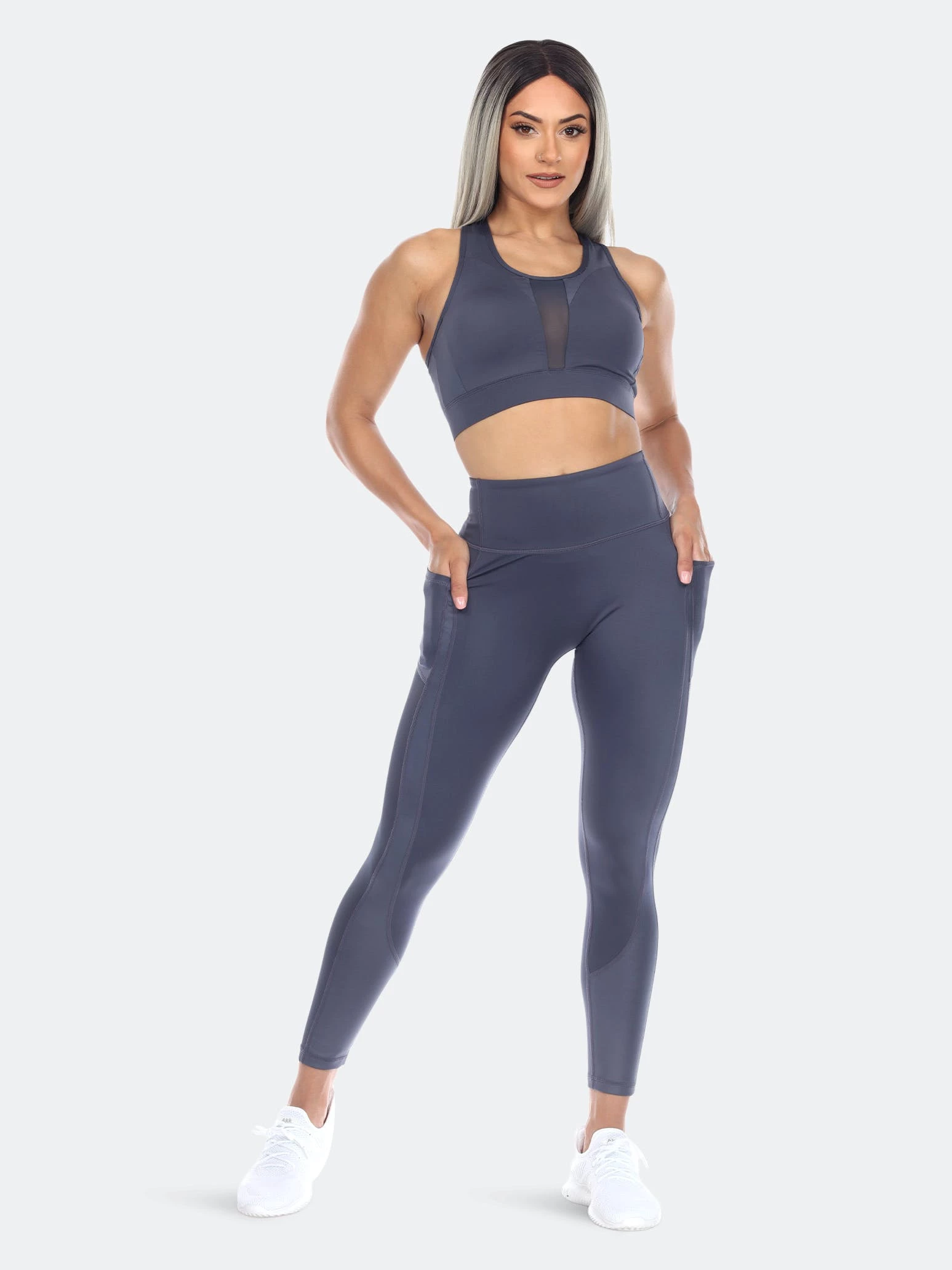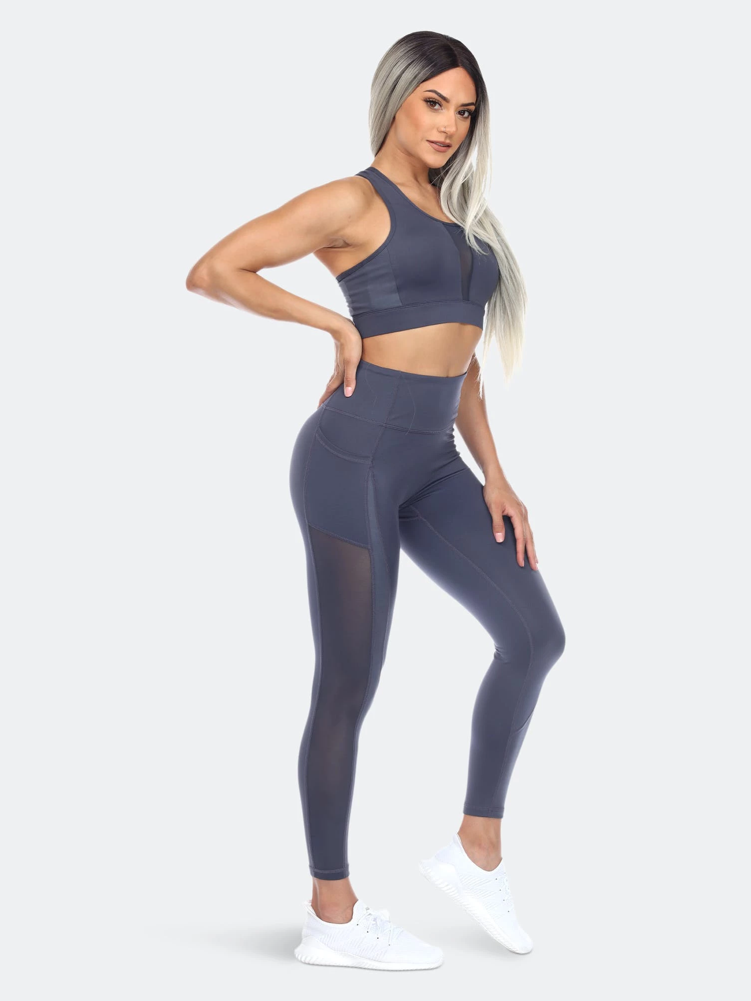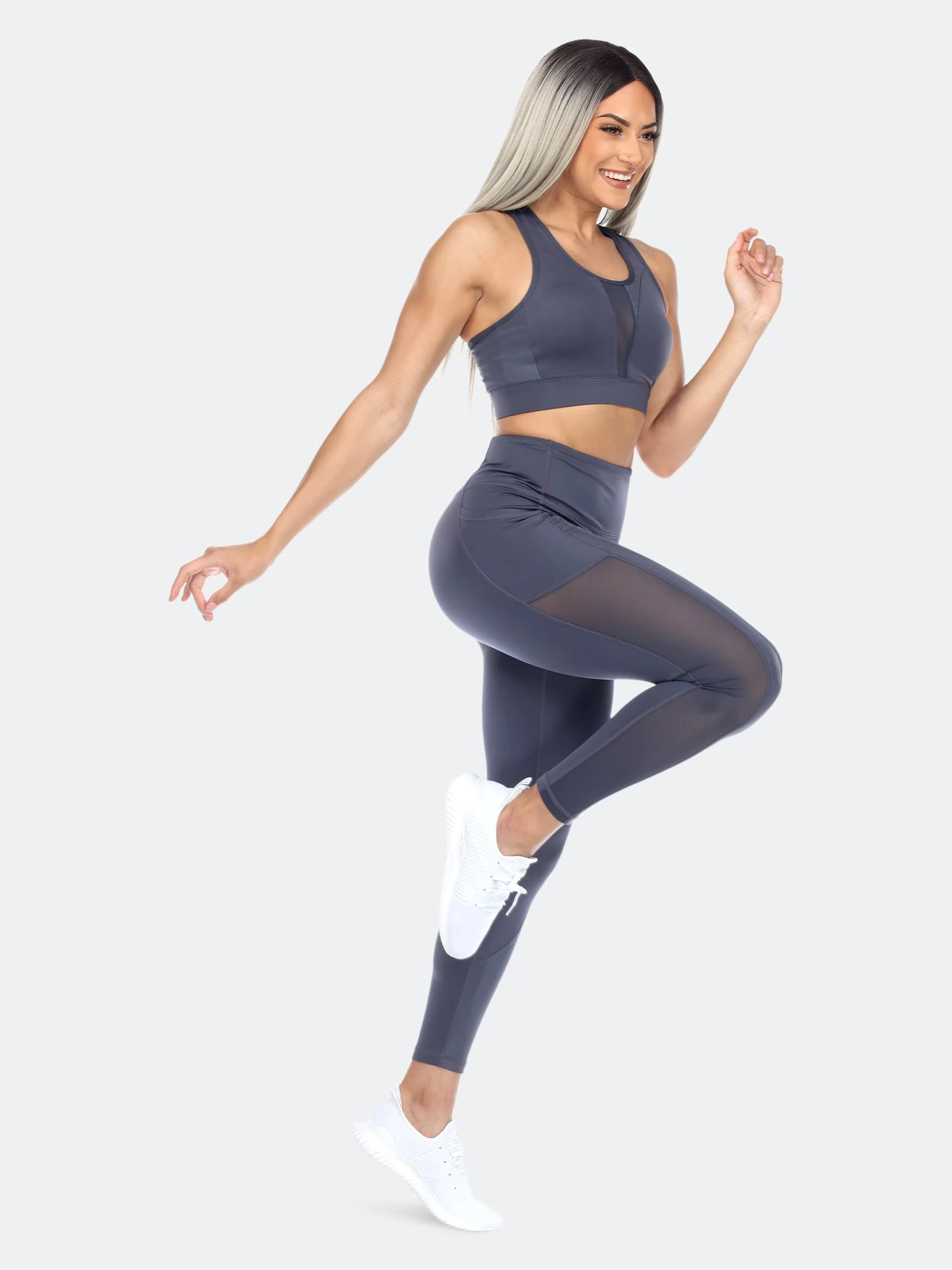 An athletic matching set featuring a racer back sports bra and a high-waist mesh fitness leggings in a variety of stylish colors to create your own unique workout looks.
